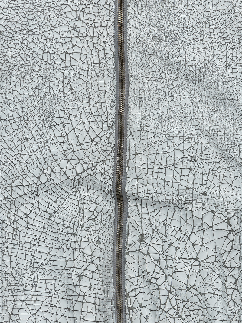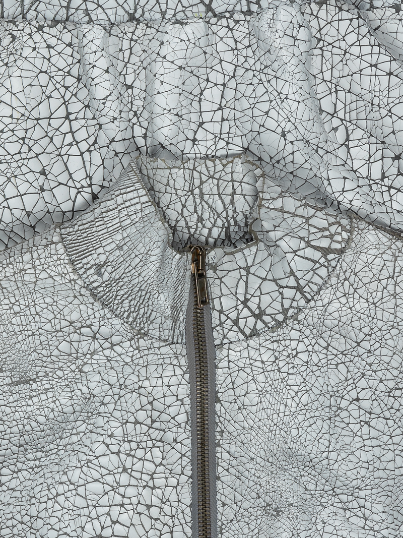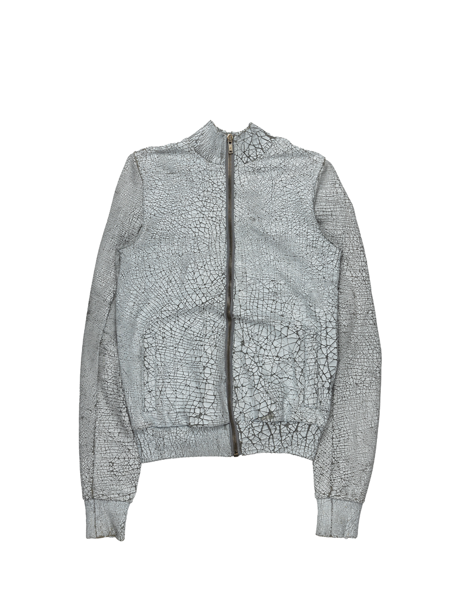 Made from a combination of cotton and fleece, this jacket features a distinct paint treatment that covers the entire garment. Over time, the paint will naturally crease, crack, and gradually wear off, creating a one-of-a-kind patina. The jacket is equipped with a zipper closure and includes a waist strap detail.