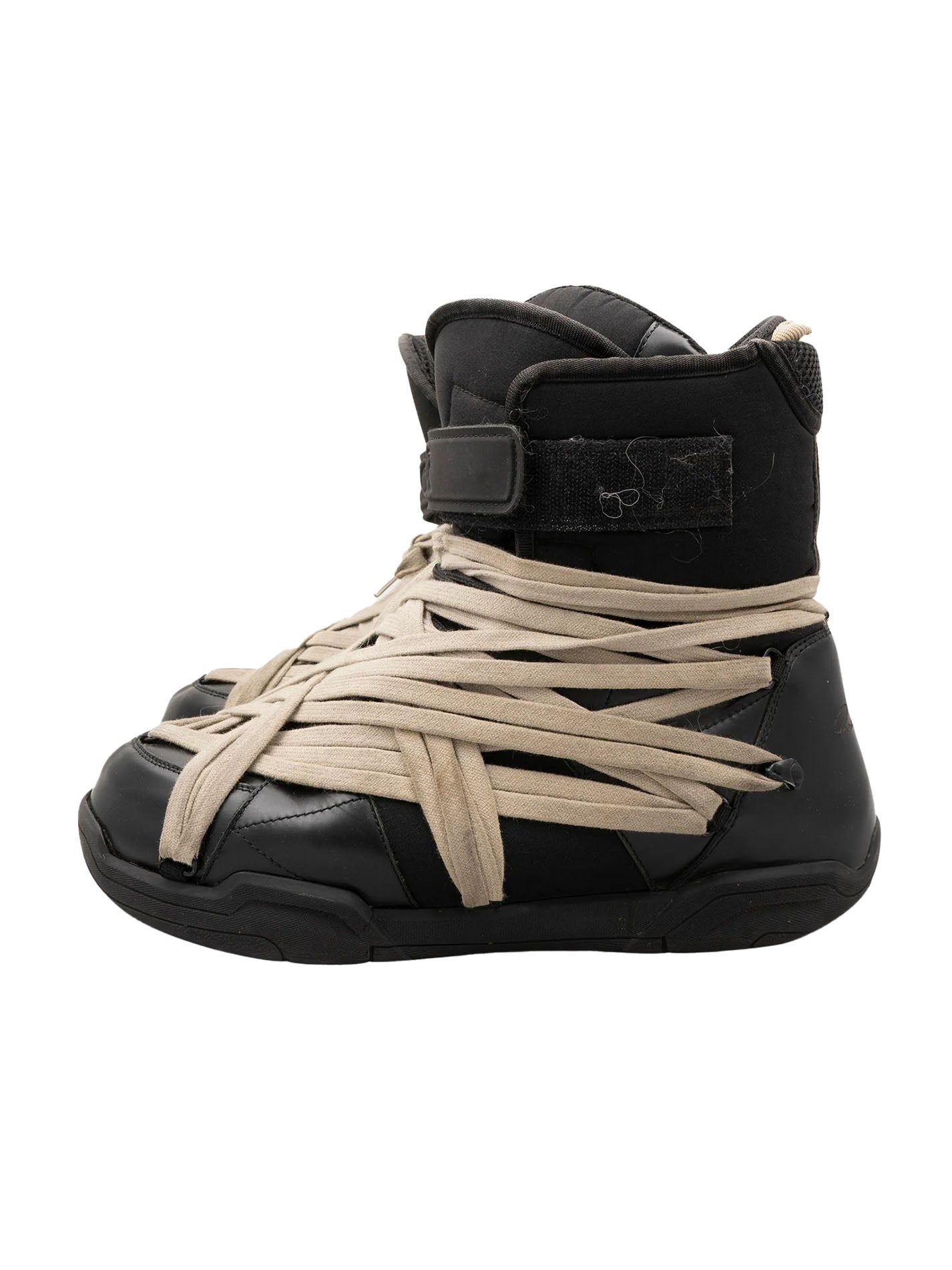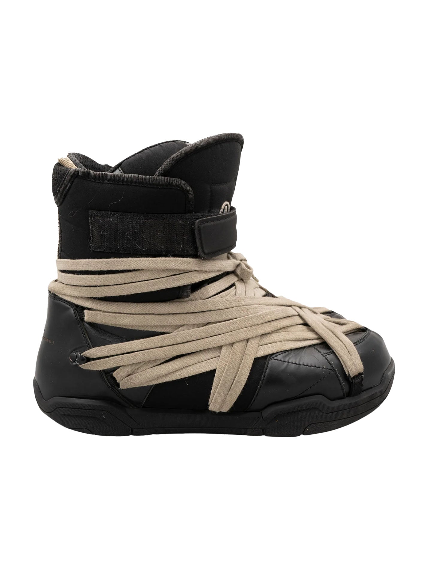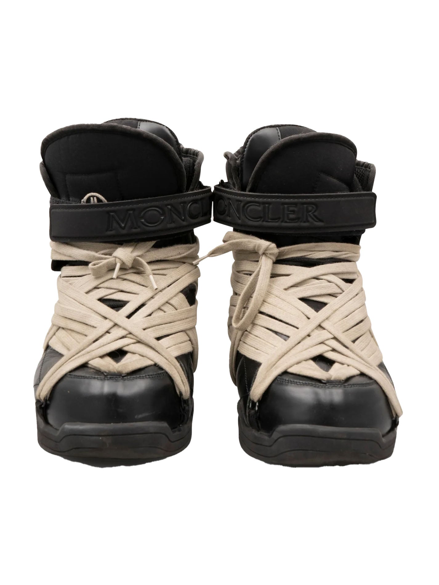 A pair of instantly iconic Amber boots from the collaboration between Rick Owens and Moncler that features the super exaggerated megalace setup.