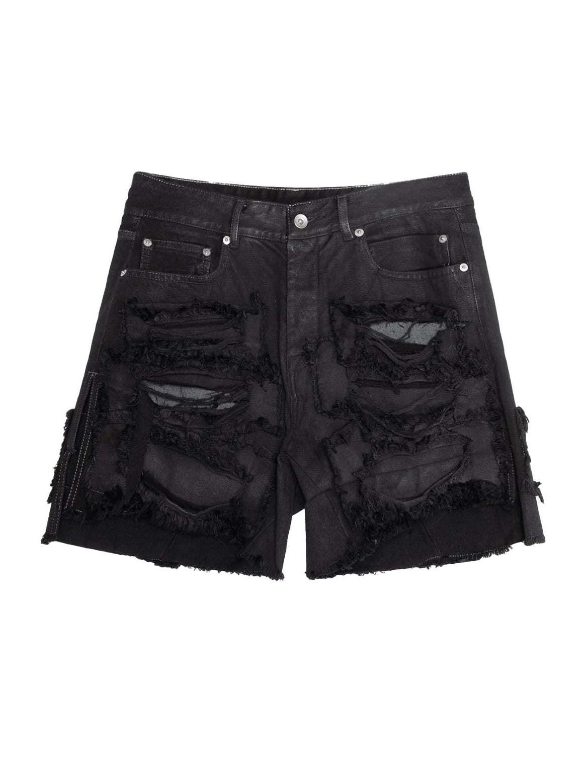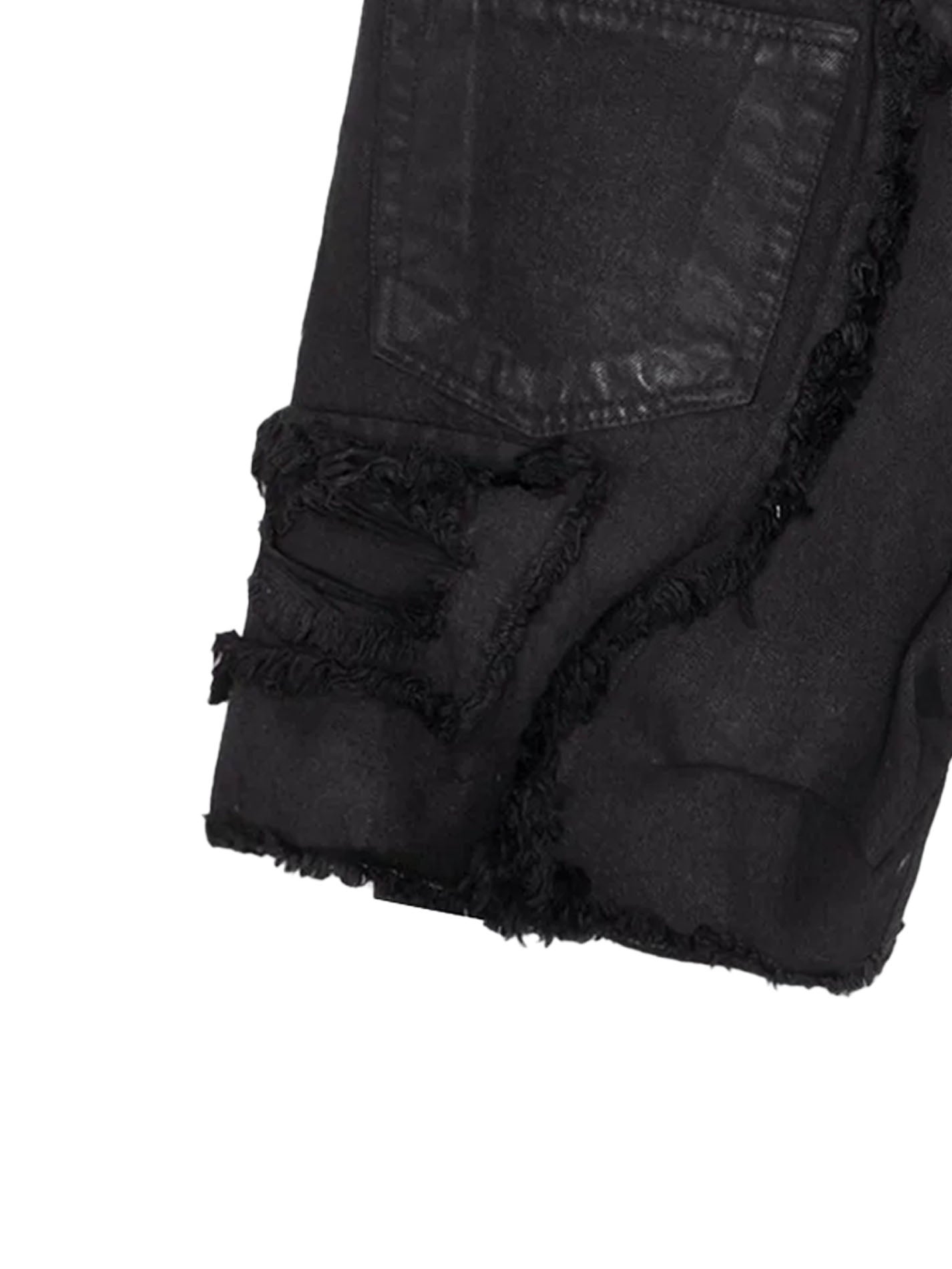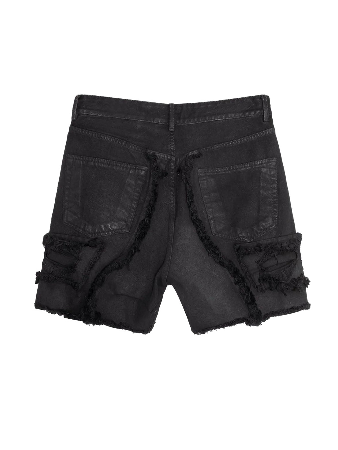 A pair of distressed black Rick Owens jean shorts in the wider "Trucker" cut.