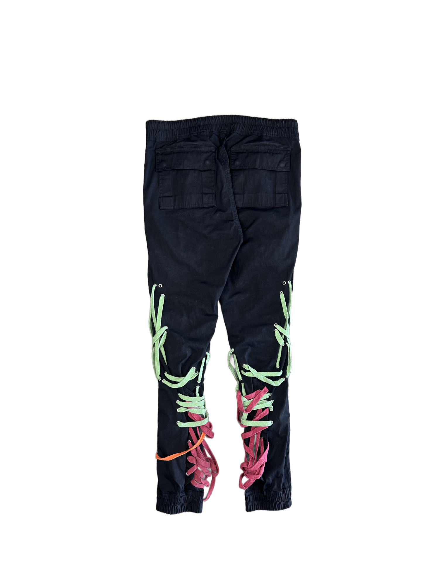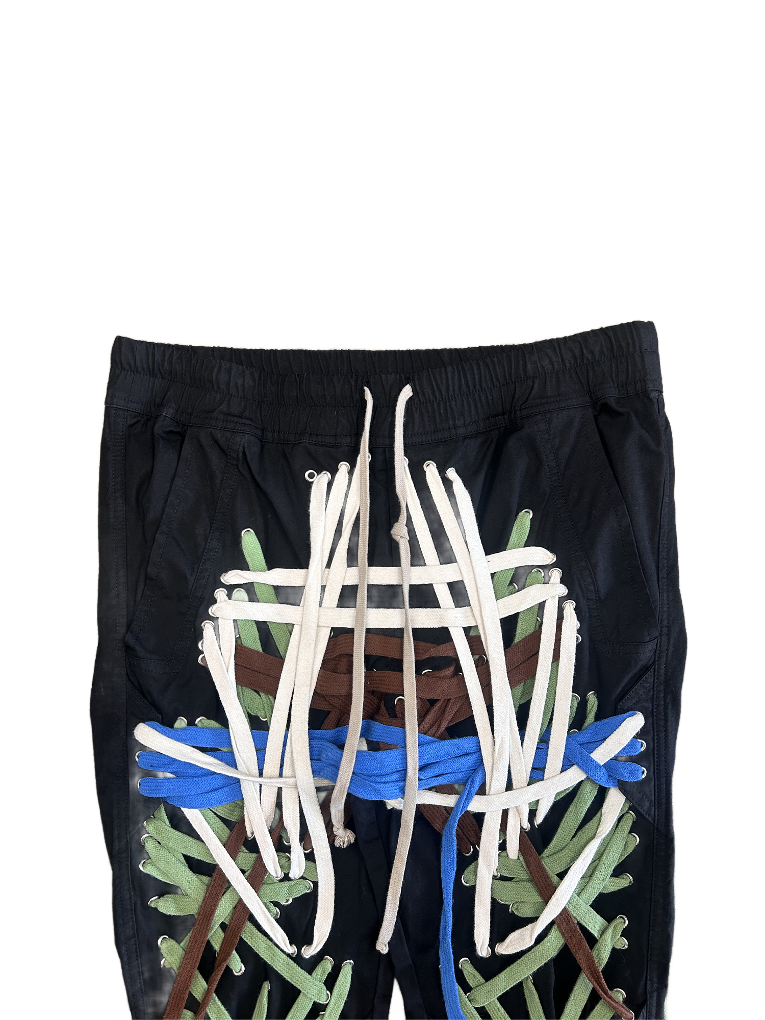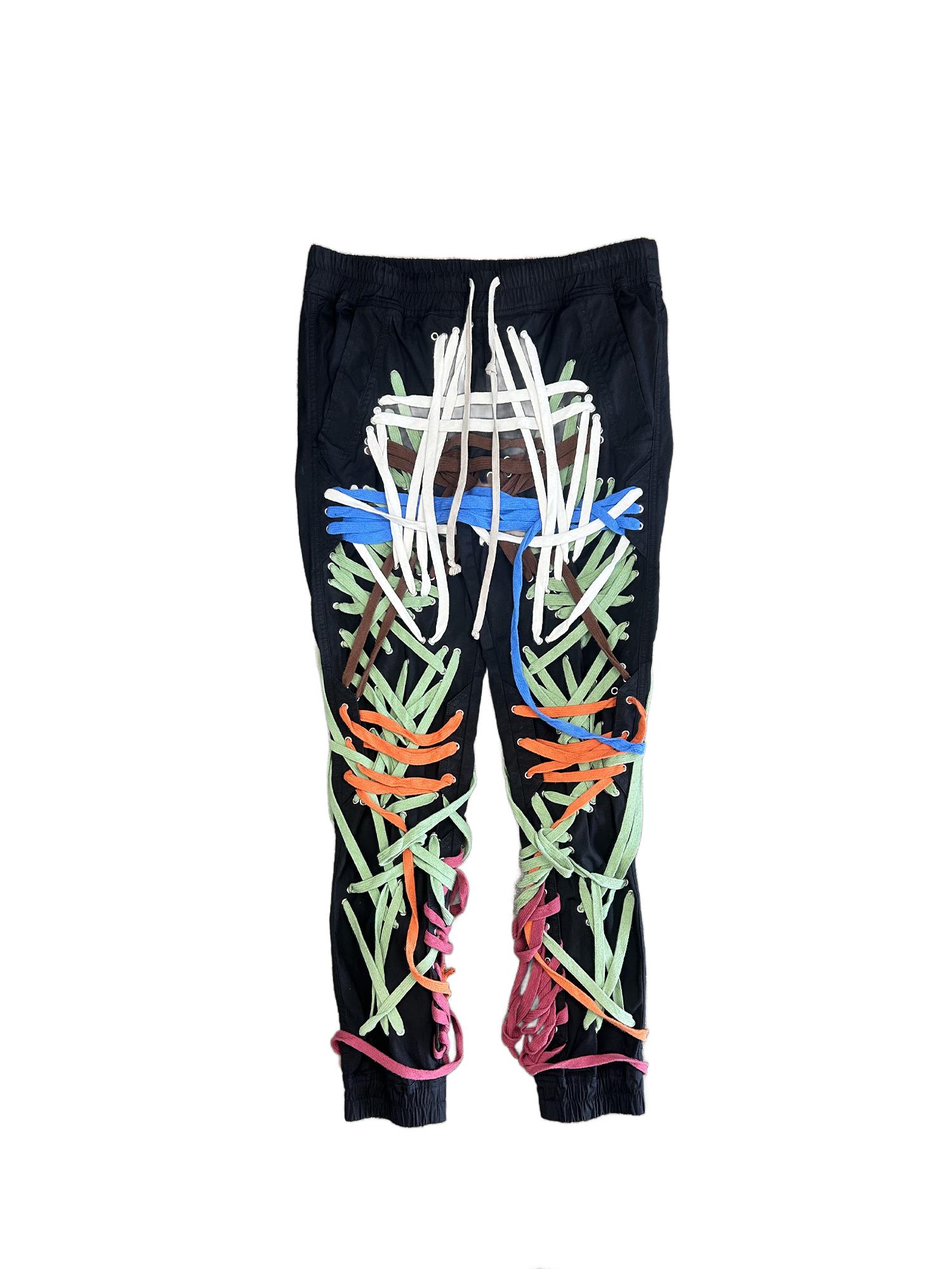 These black joggers feature an elastic waistband, ankles and showcase a megalace pattern throughout the pant