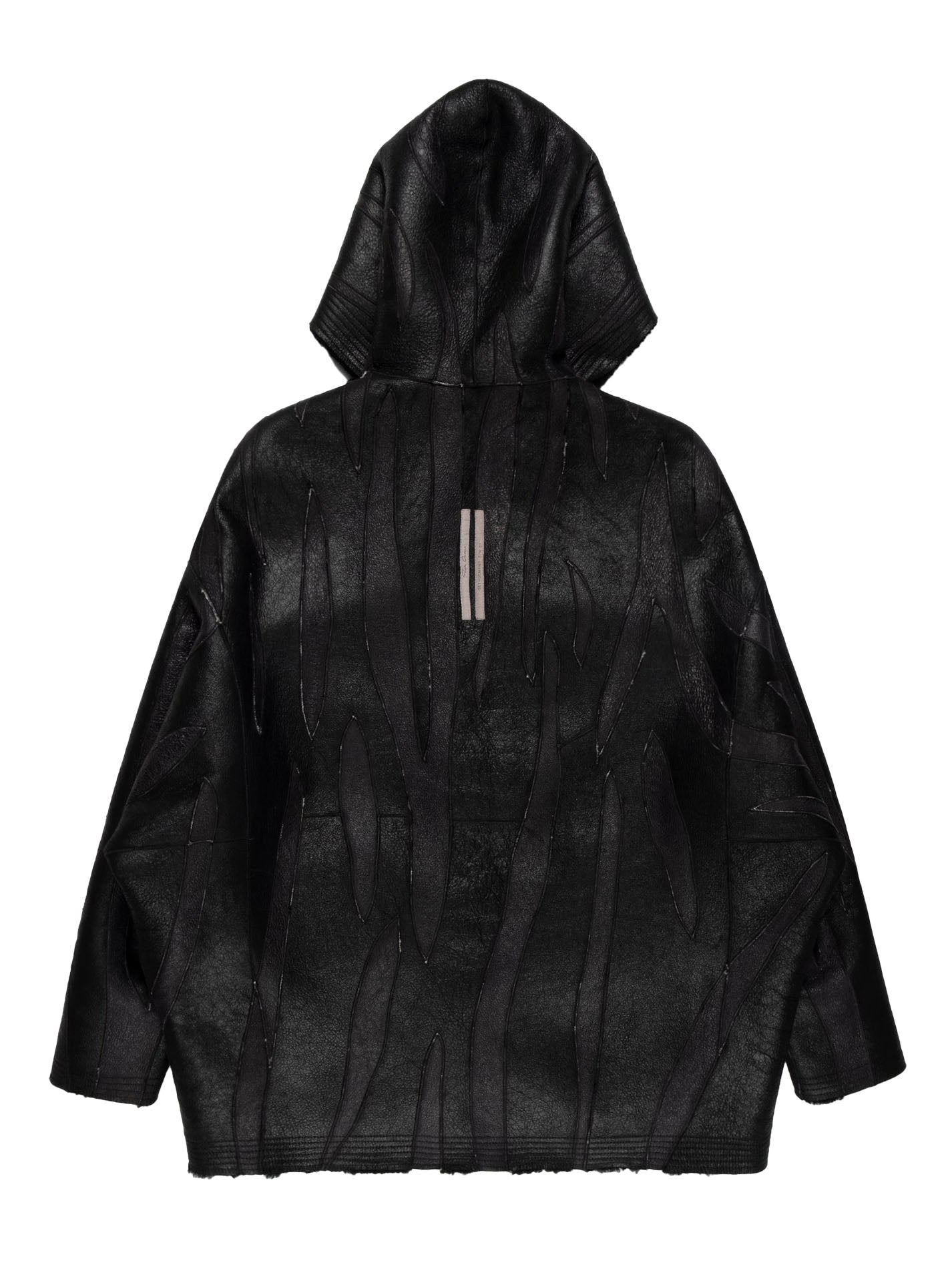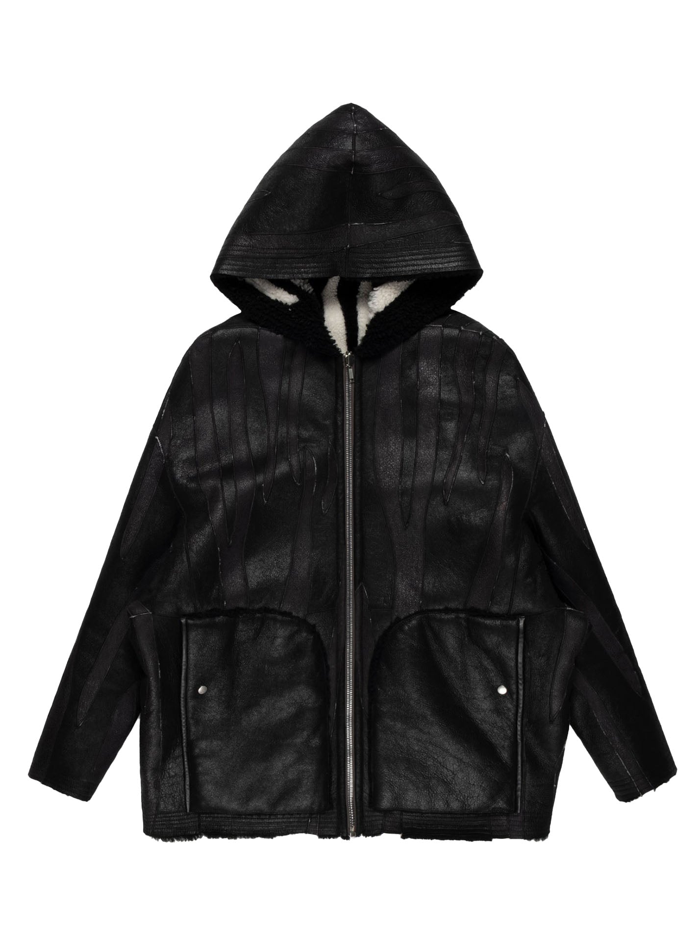 This reversible jacket from Rick Owens’ FW2021 collection features a bold black-and-white zebra shearling on one side and smooth black leather on the other, subtly detailed with tonal zebra patterns. Designed with a relaxed fit, it includes a hood, full front zip, and functional pockets on both sides. Both luxurious and practical, the piece blends statement style with exceptional comfort and texture.