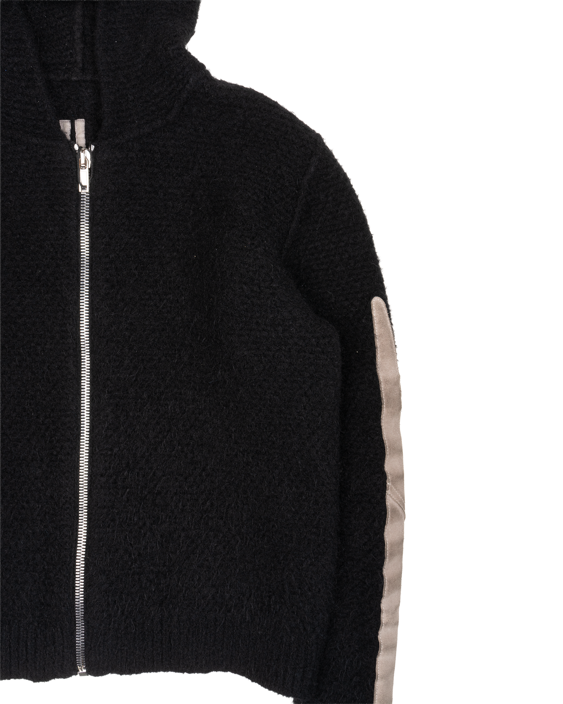 This wool hoodie features silver tone front zip hardware and wool patched cutouts on the sleeves