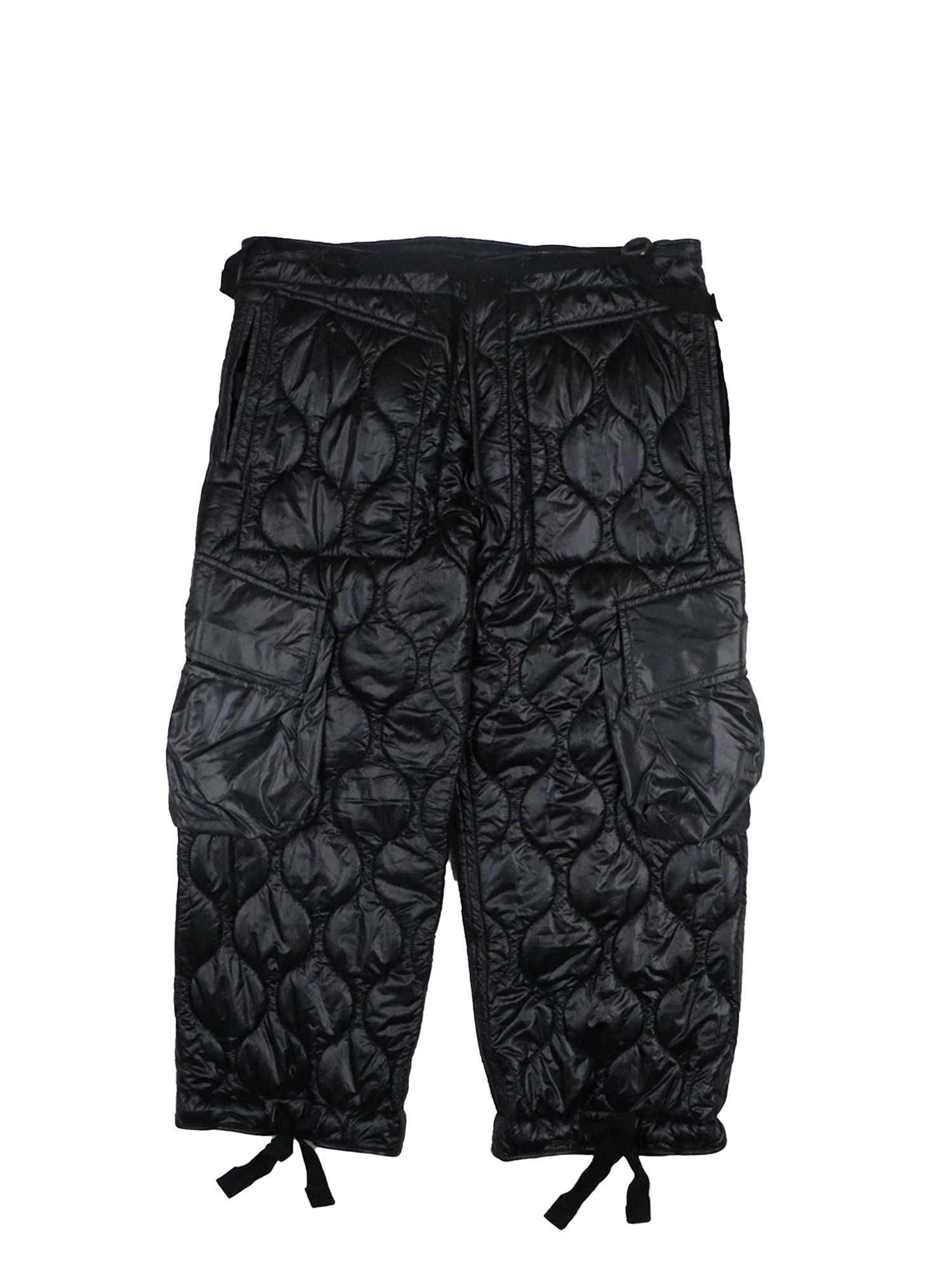 The pants have lightweight nylon taffeta patch pockets that break up the quilted pattern. They also have button-closed slits inspired by military overpants, allowing access to pockets worn underneath. The vintage military inspiration is seen in the overlapped fly with leather bound edges and two waist buttons. The pants are completed with drawstring webbing at the waist and hem for adjusting the fit.