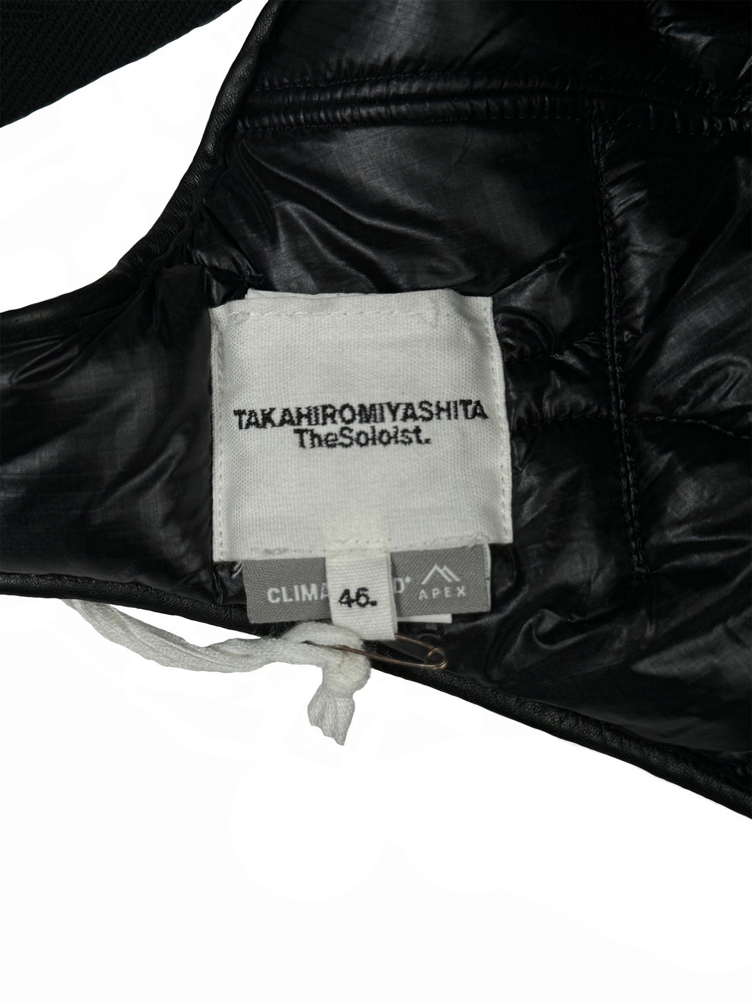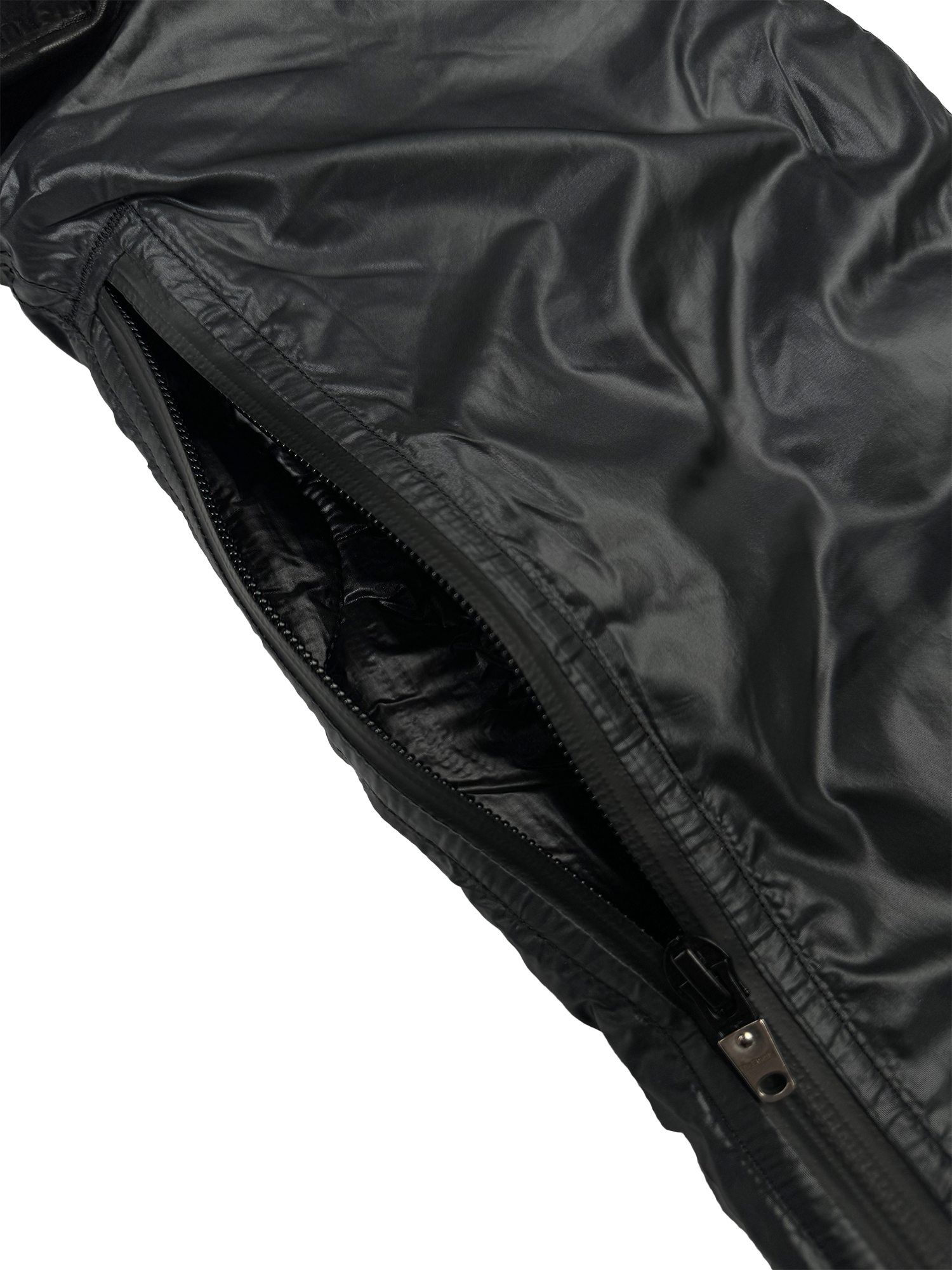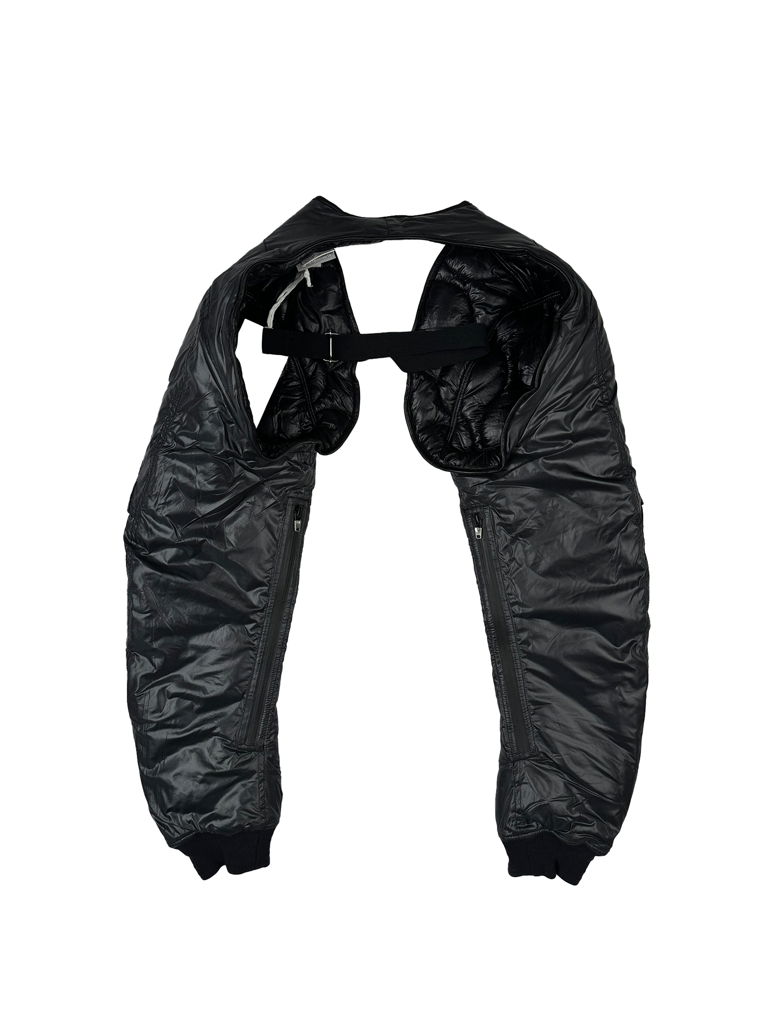 Flight jacket sleeve attachment, featuring a fastening strap, two traditional MA-1 cargo pockets, and zipper opening along the sleeve to expose the wearer’s arms.
