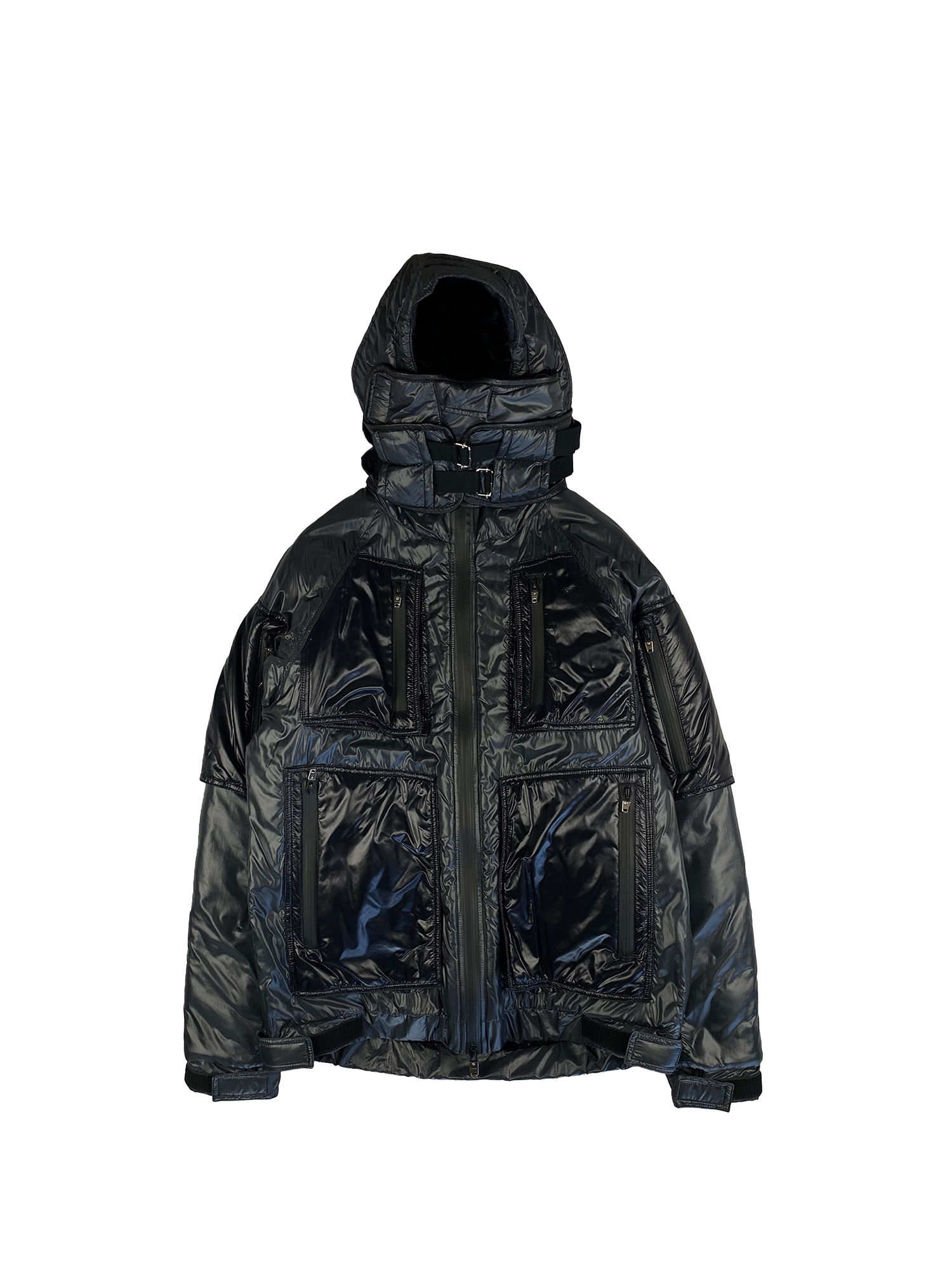 This lightweight flight jacket contains six pockets, Velcro fastenings at the hems and cuffs, face mask closure, and a complex interior fastening system to strap the wearer in. It additionally features Primaloft lining to stay insulated.