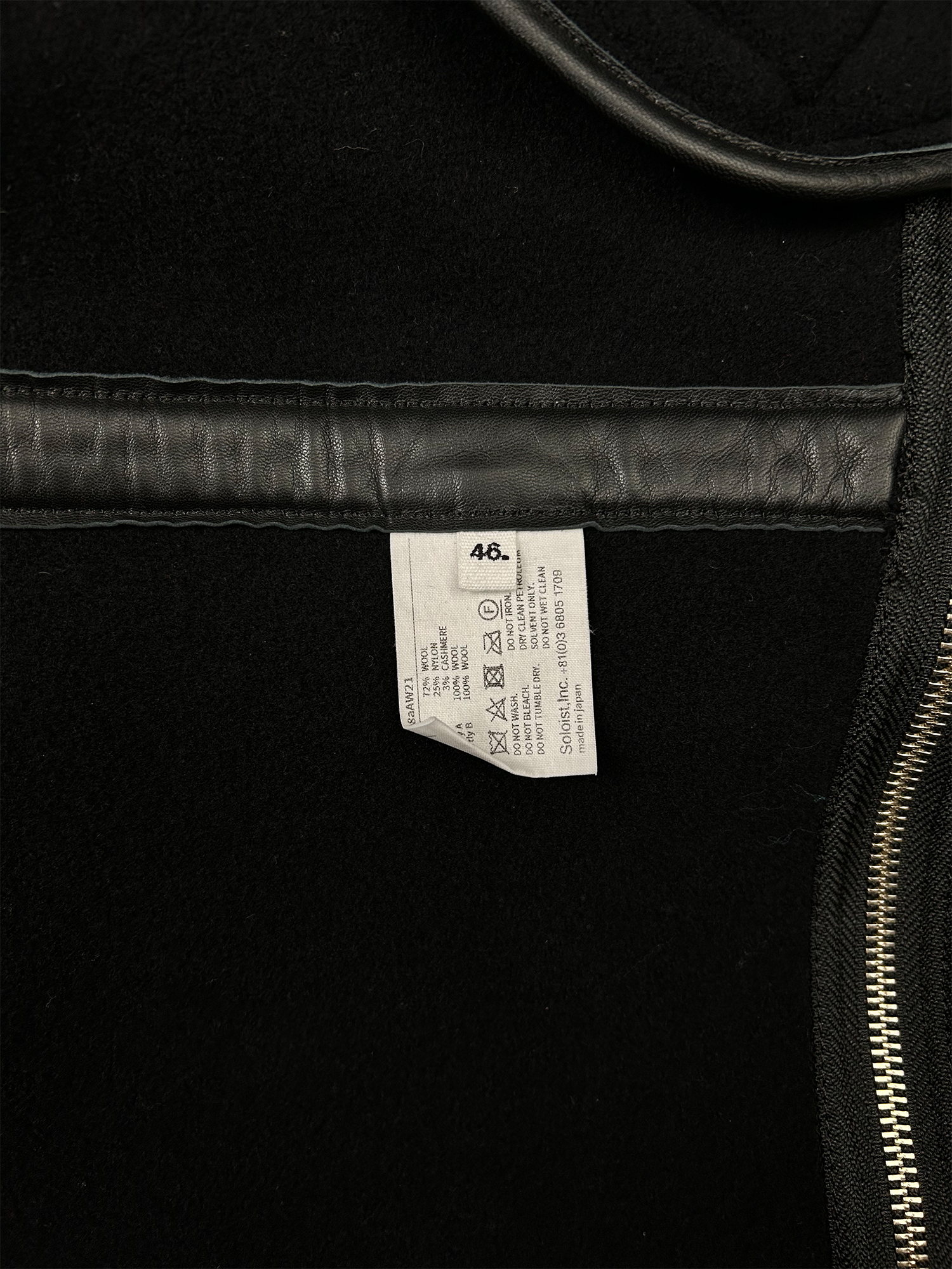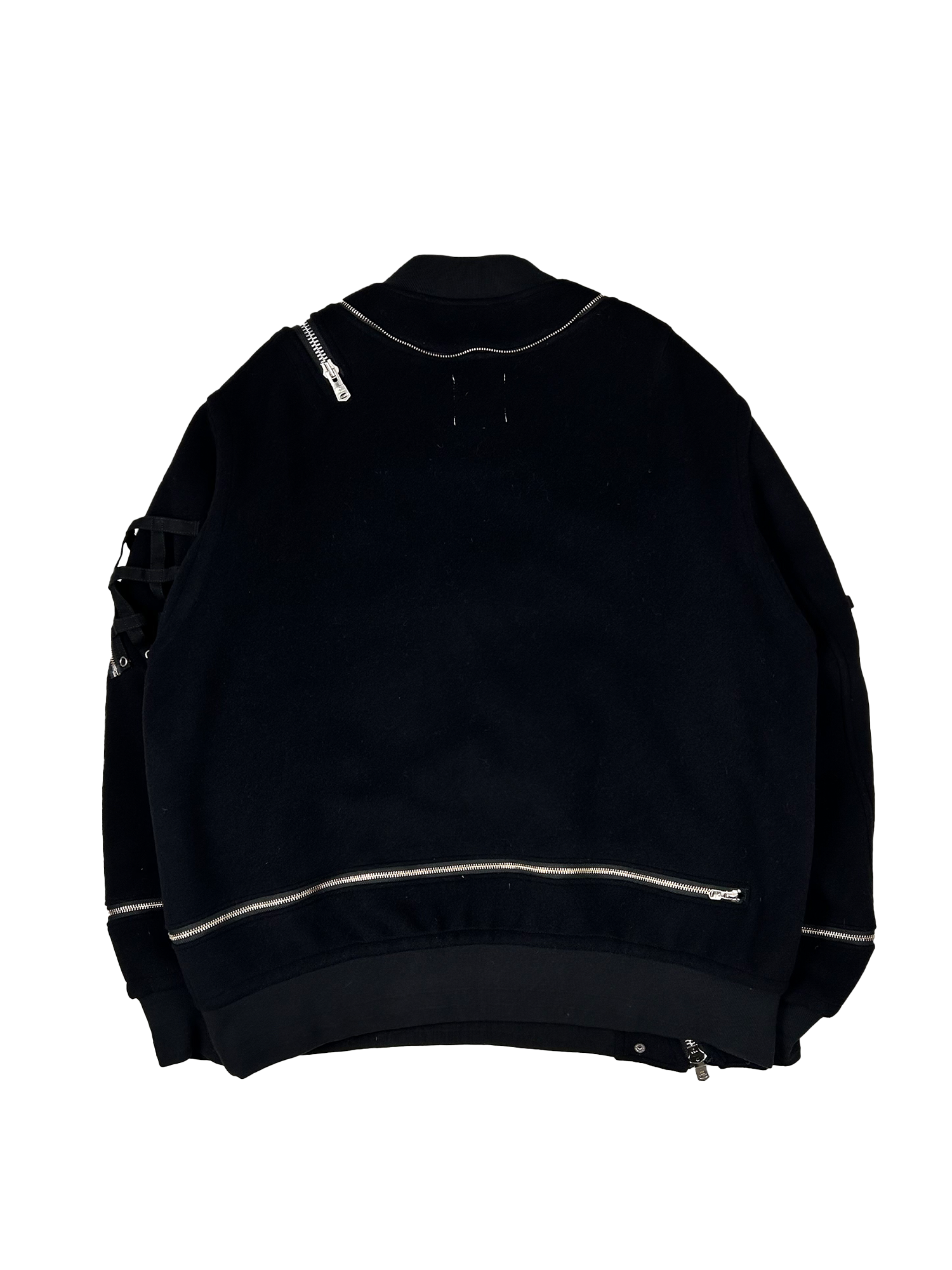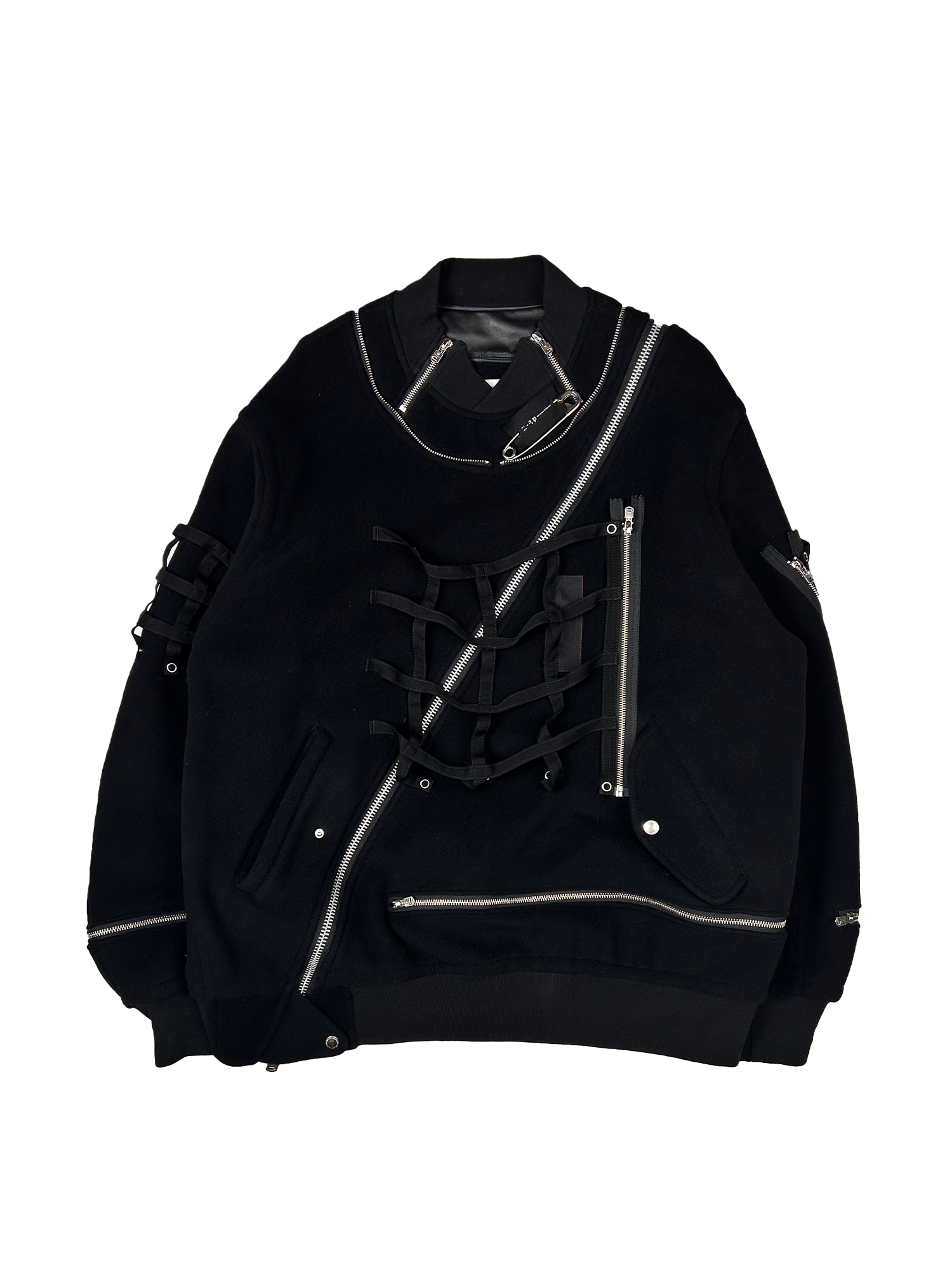 This oversized cross body zipper bomber jacket features partially detachable nylon lattice detailing on the front and sleeves. It also includes a zippered vent at the sleeves, elasticated rib knit cuffs and hem, and a detachable safety pin at the collar