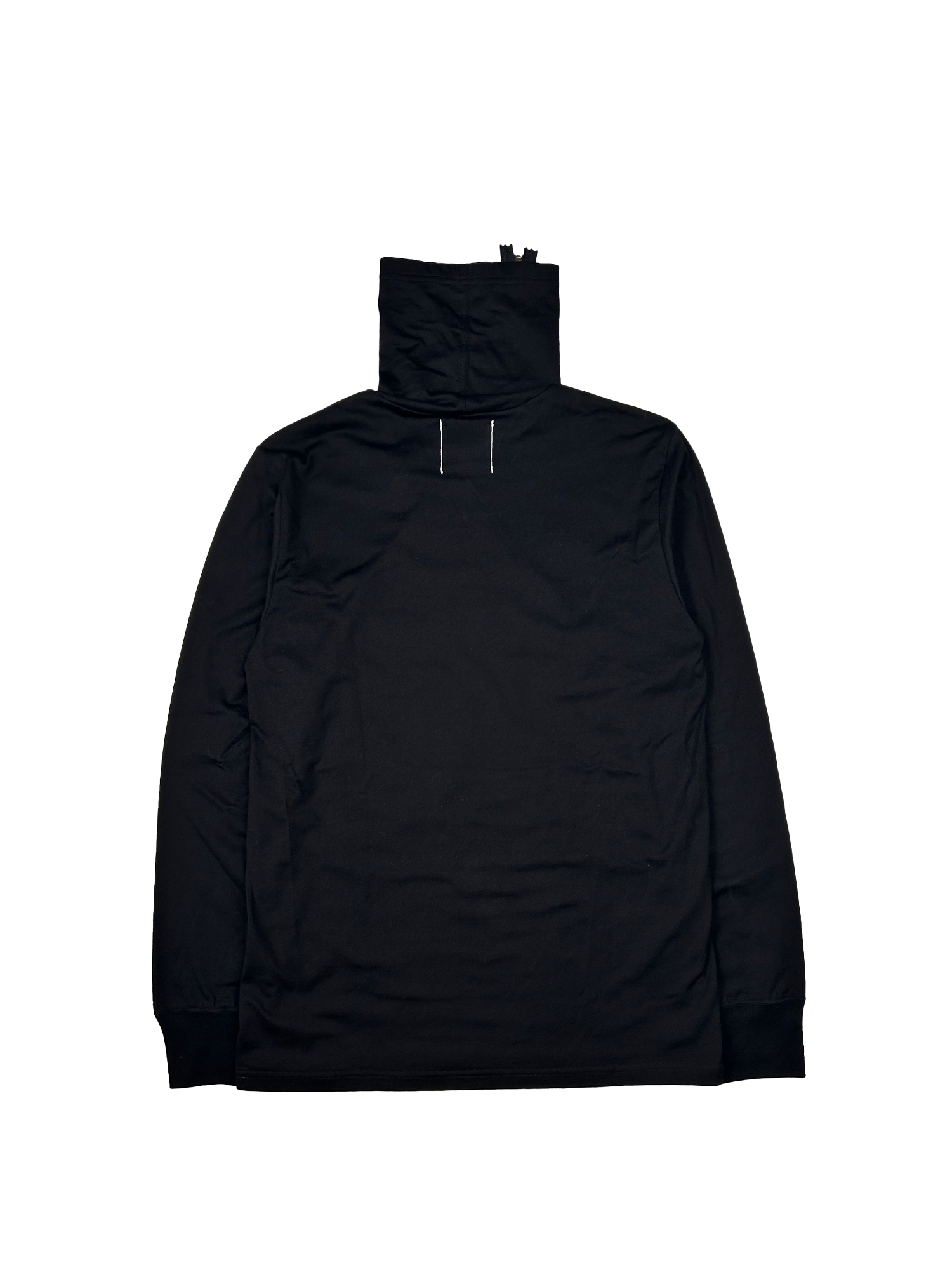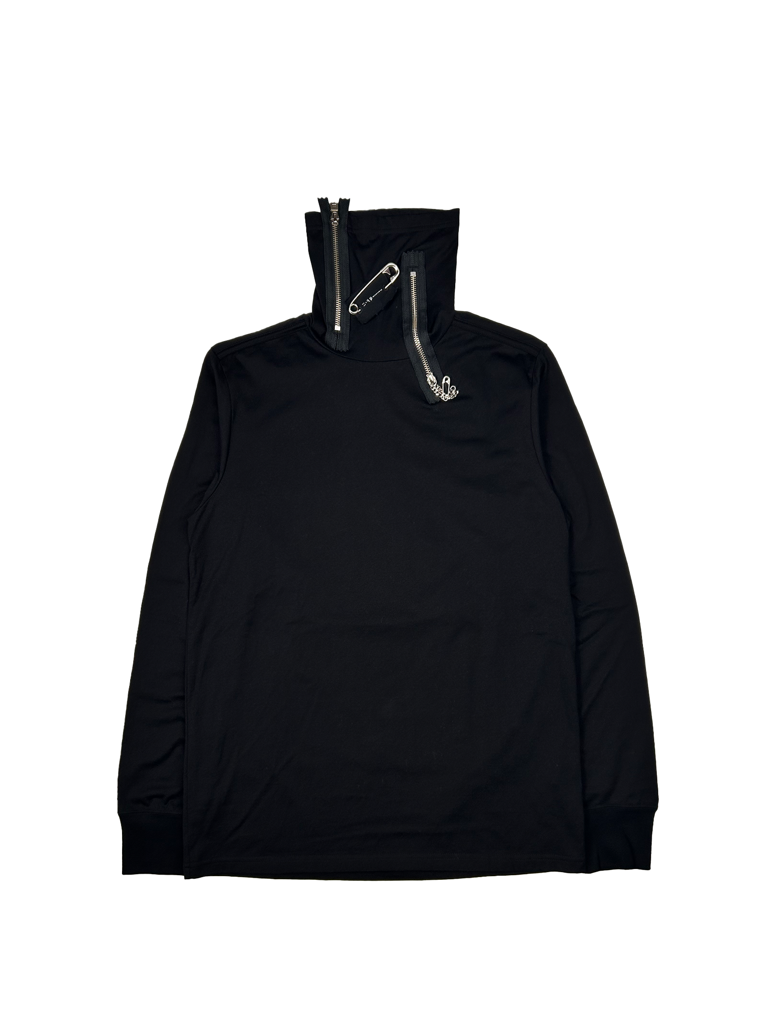 This black cotton jersey knit turtleneck features long sleeves, a dual zip design, and a safety pin detail.
