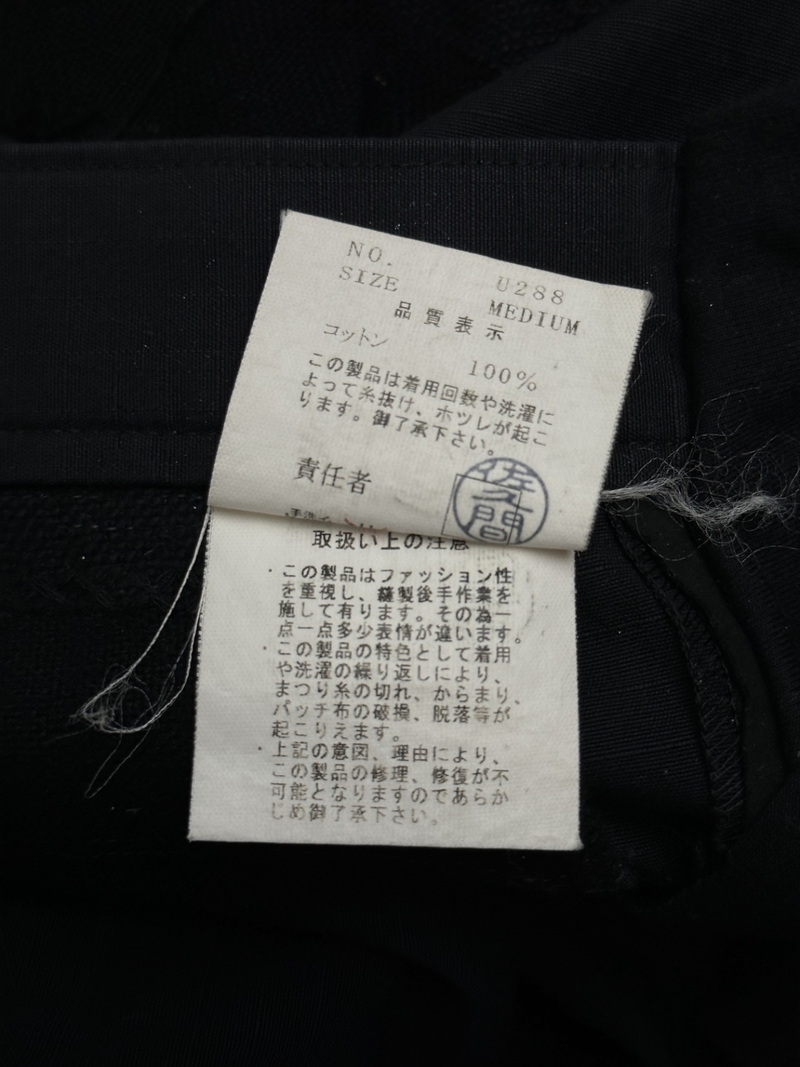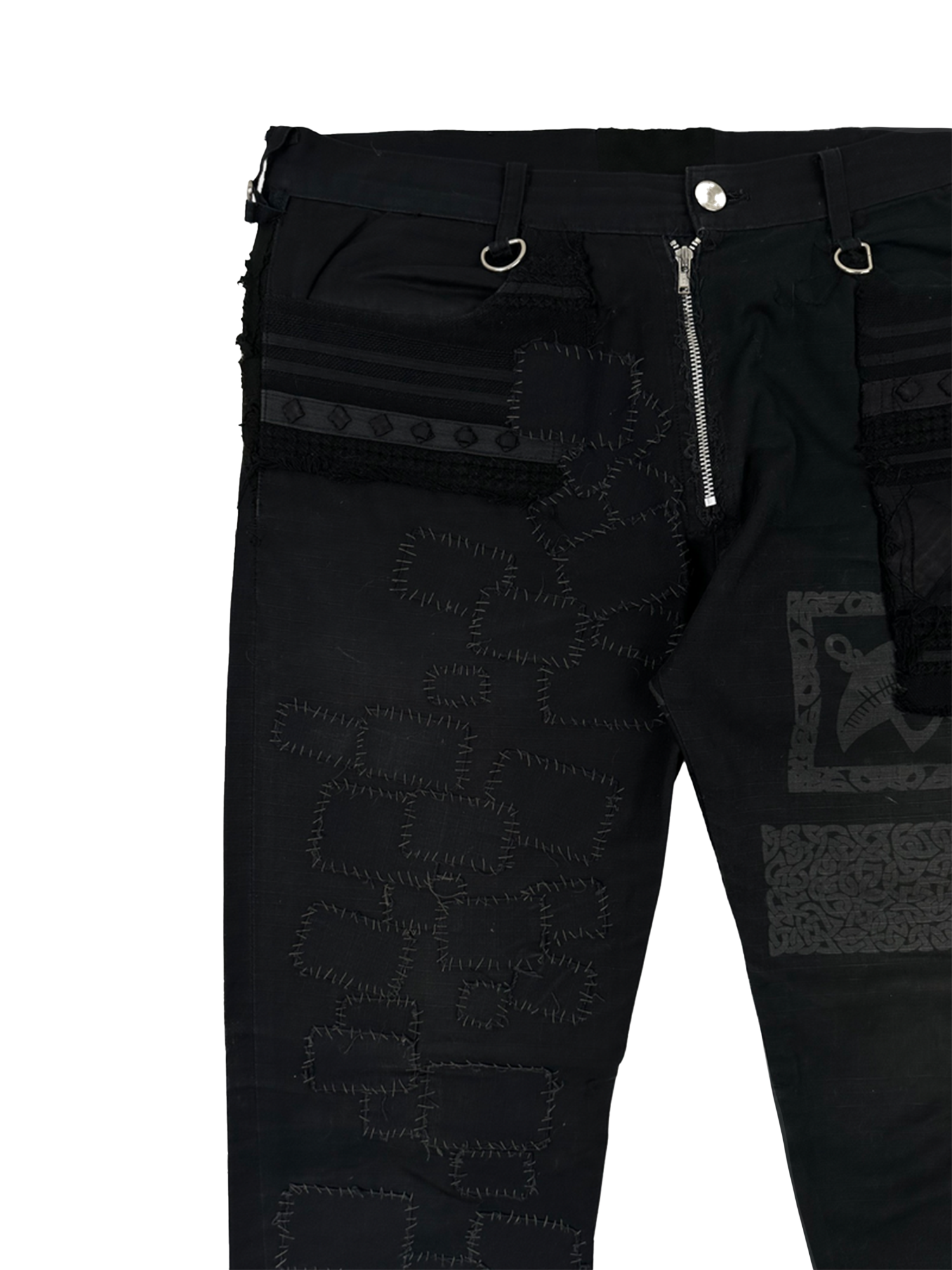 An integral and notable piece of Jun Takahashi’s first Paris Fashion Week collection, the hybrid pant is riddled with a contrasting fabrics and patterns. Patchwork emphasizes one leg while the other boasts graphics and texts. Patterned zip pockets, belt loops, exposed front zip closure, and adorned with silver-toned hardware.