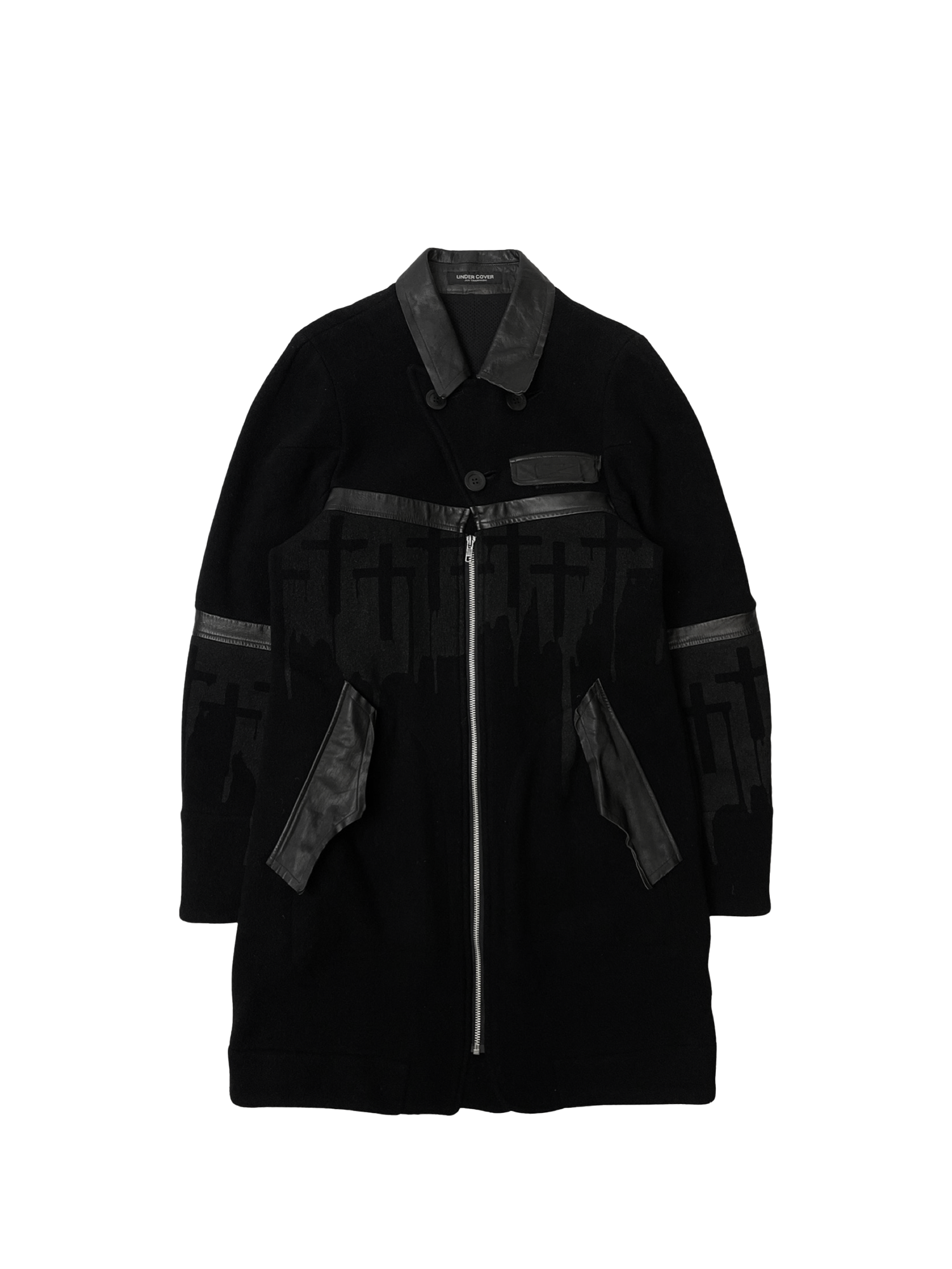 Contrast cross print plastered throughout the middle of the overcoat's entirety while maintaining its theme with more contrasting fabrics and leather trims. Leather collar, three leather front flap pocket, trio of front buttons and a zip closure.
