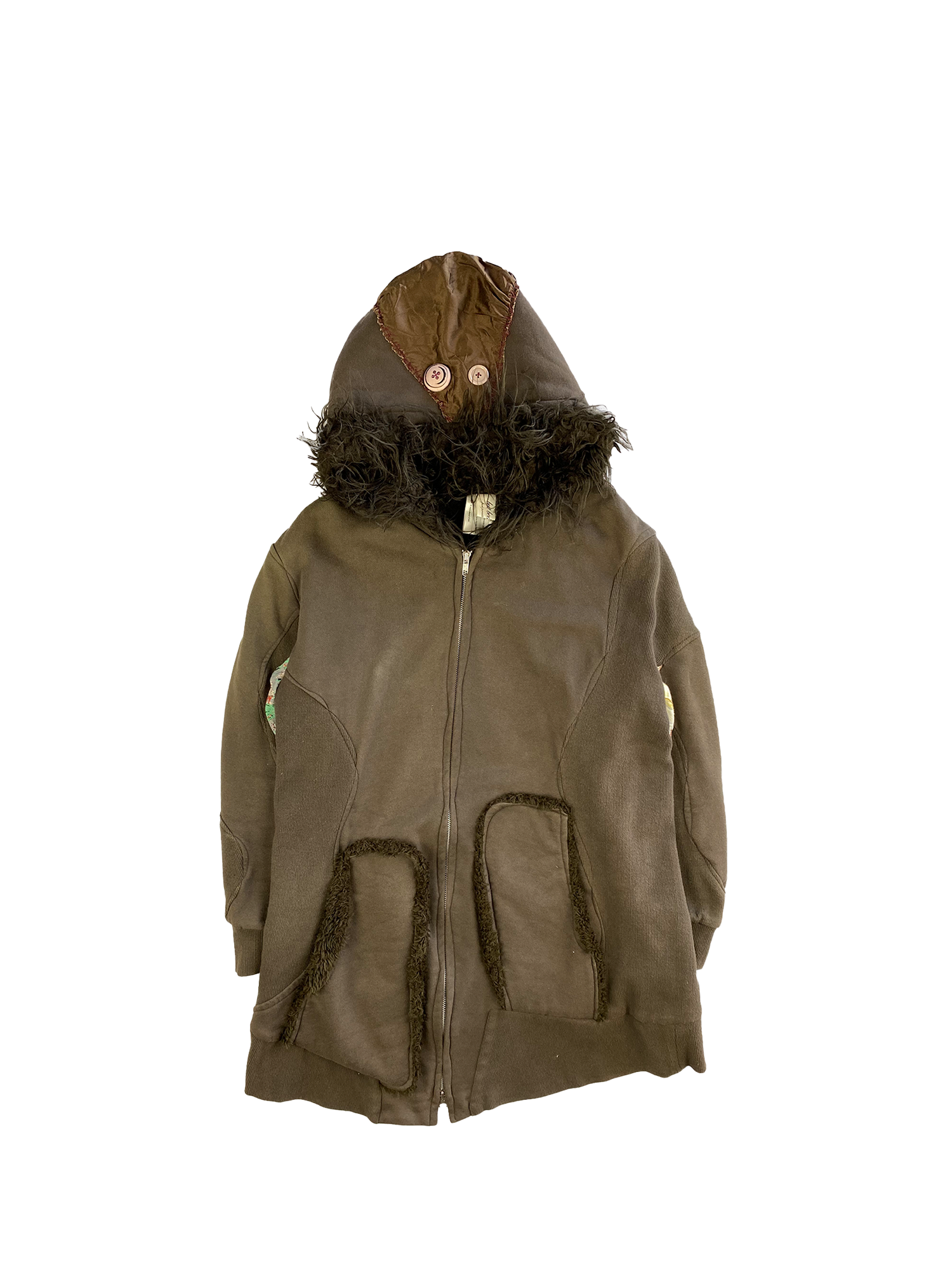 Oversized hoodie lined with faux fur and decorated with playful fabric patches.