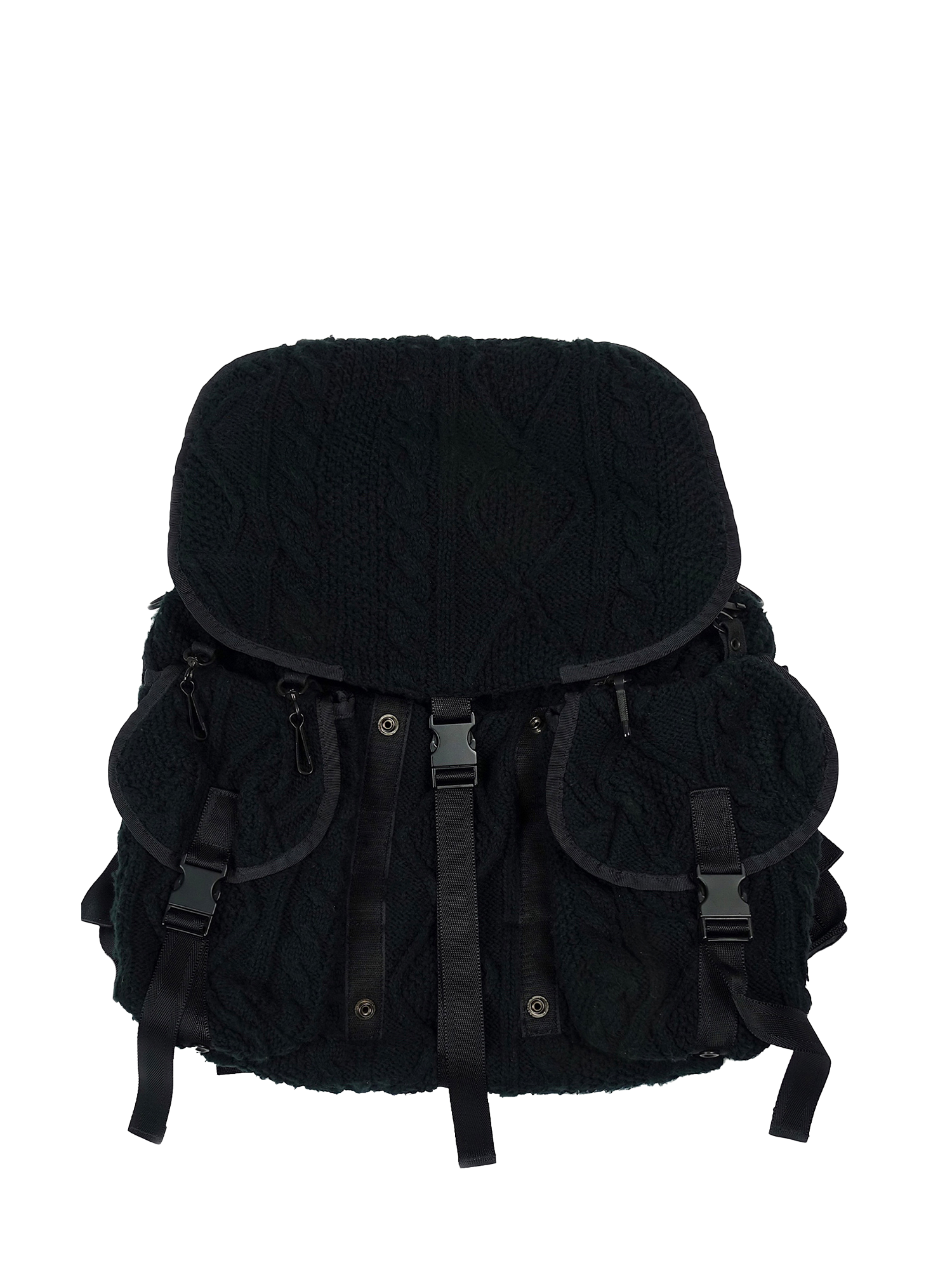 Featuring knit material covering the backpack, it has 4 attachable pockets (3 sacks and 1 long pouch.) and double section in itself. Can adjust sacks and pouches by velcro and snaps. There are 5 of D-Ring details each side (Left and Right).The chain is original component of this backpack.
