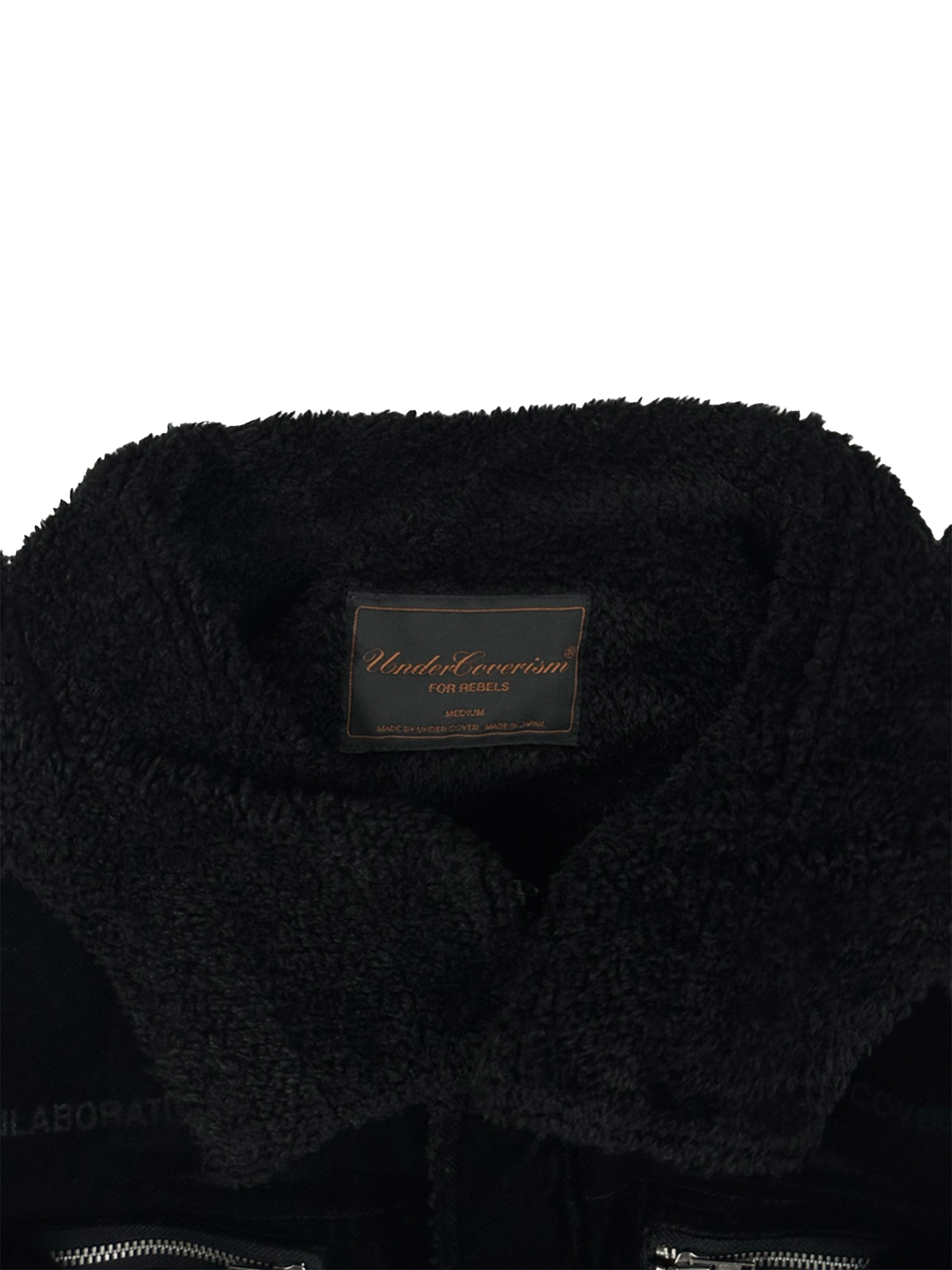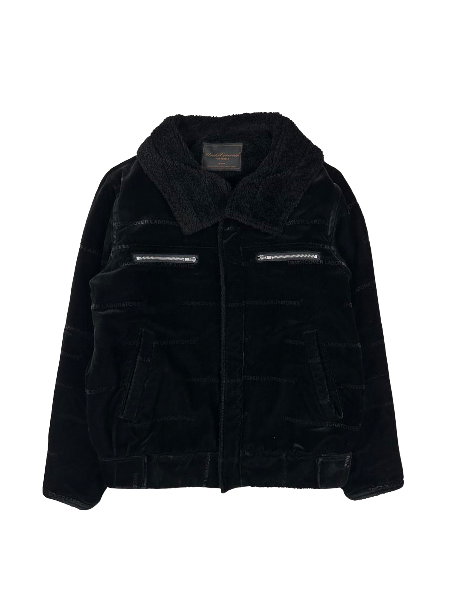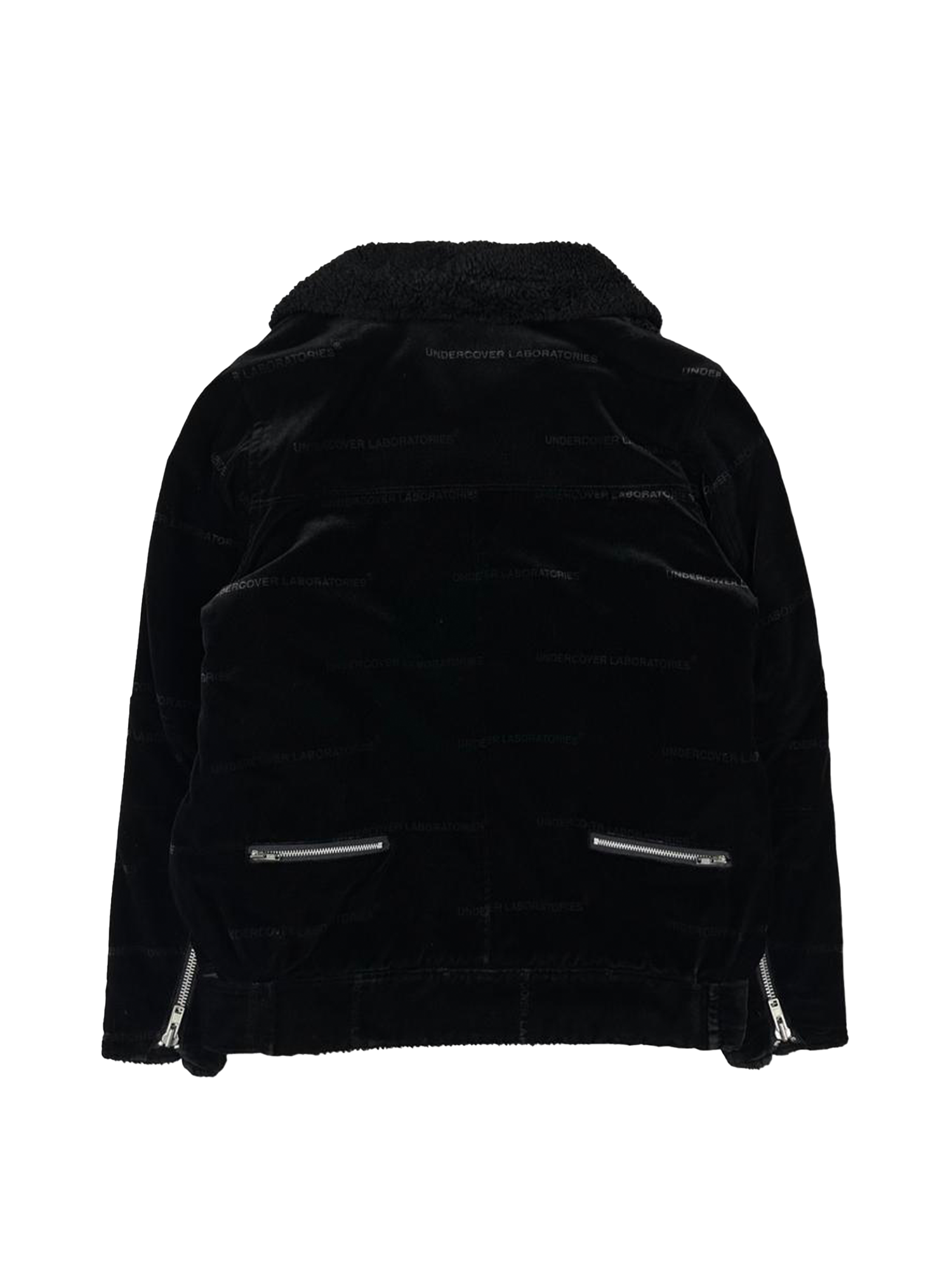 Constructed with a plush velour exterior donning ‘UNDERCOVER LABORATORIES’ throughout and warm shearling lining as shown through its exposed lining collar. Two front and back exposed zipper pockets, slit front pockets, sleeve zippers, and concealed front zip closure.