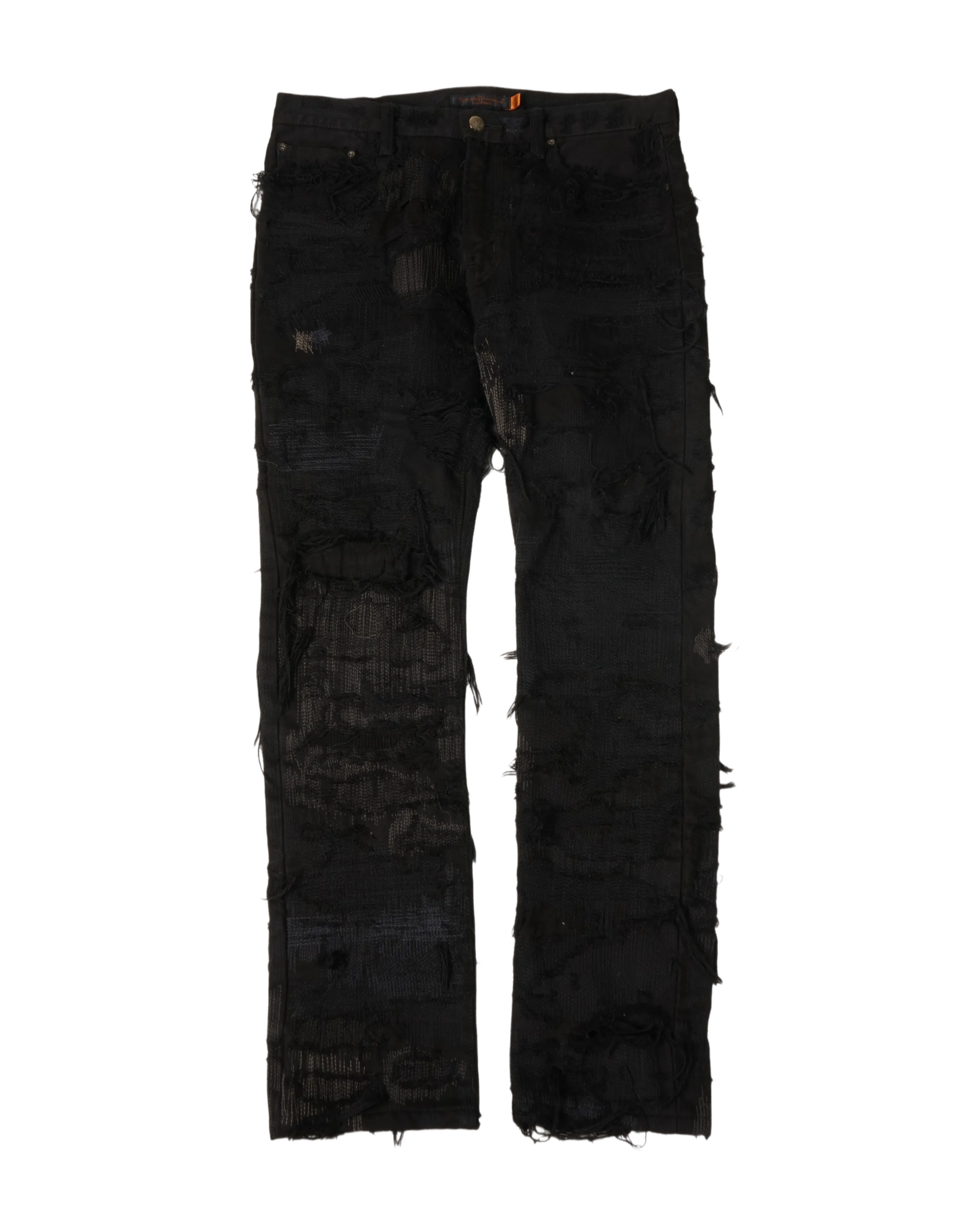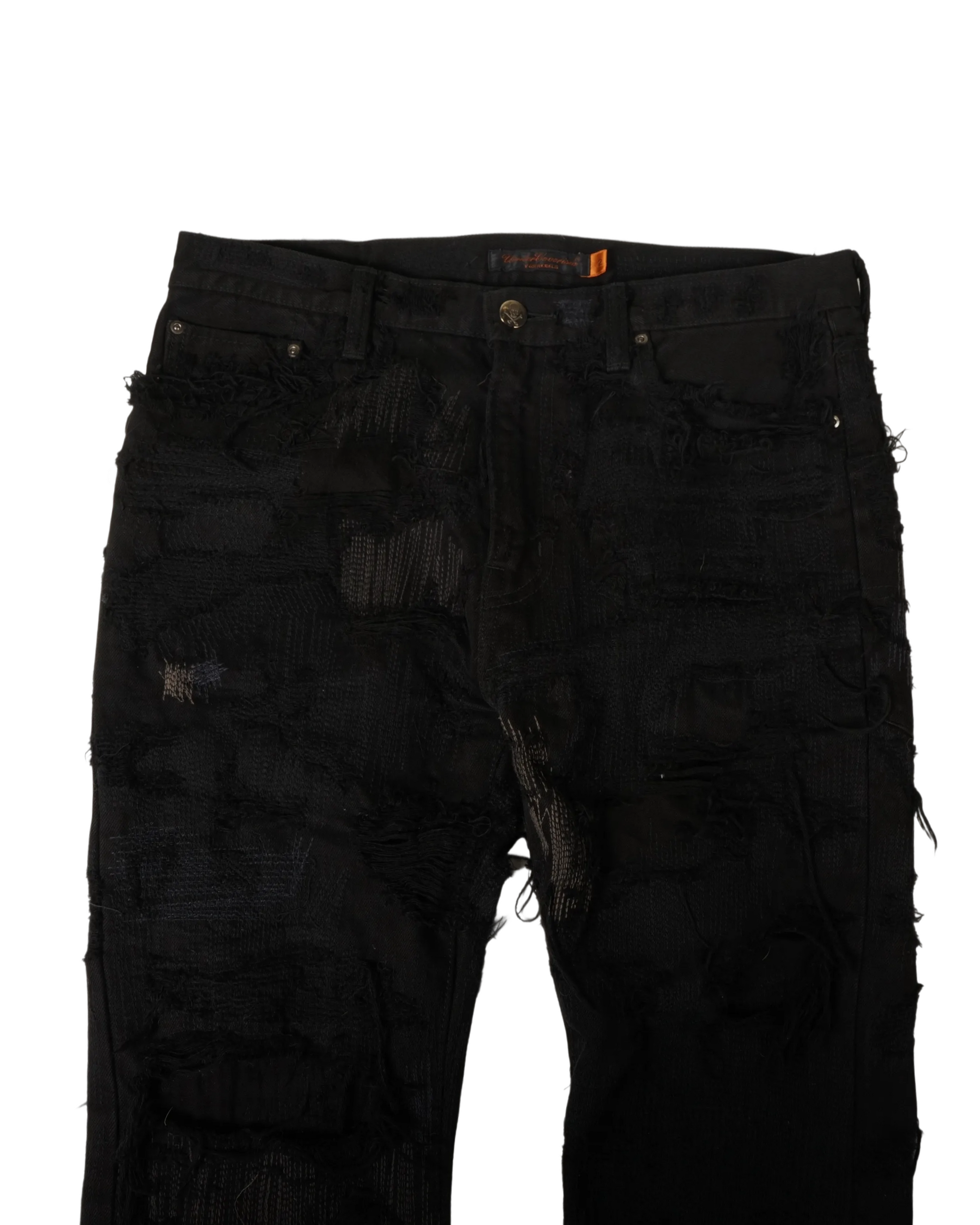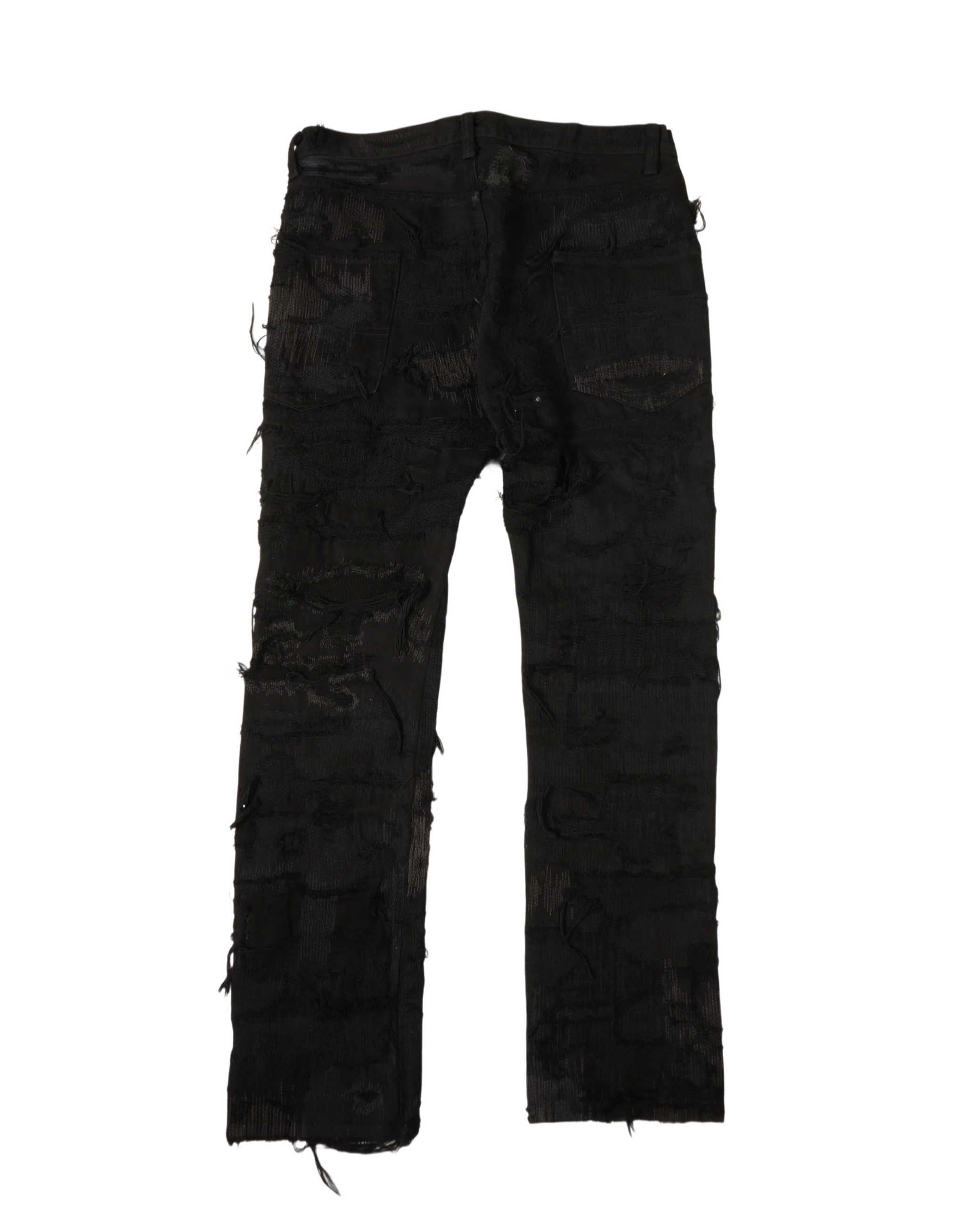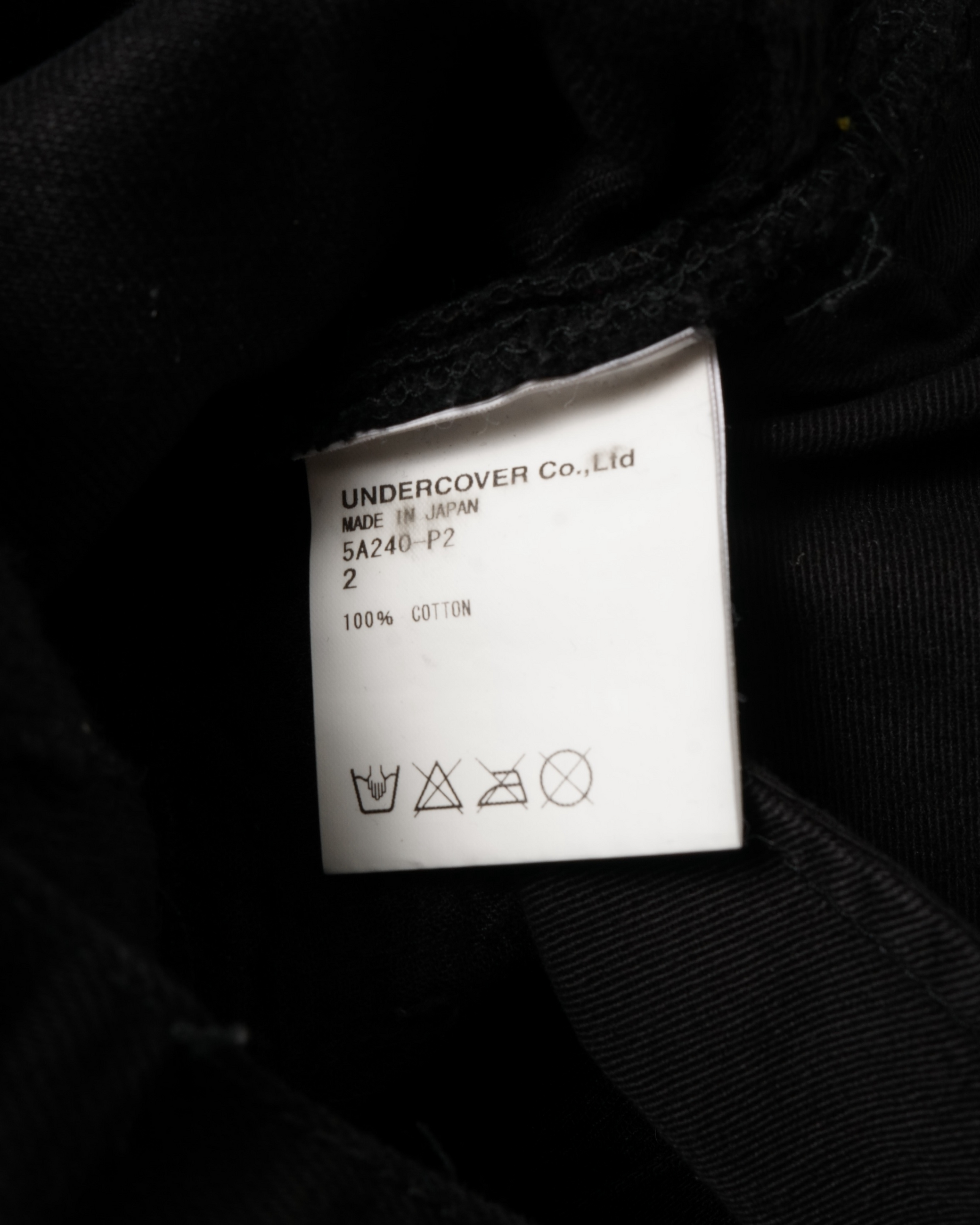 A defining piece from Undercover’s early denim offerings, the “85” Black Denim combines Jun Takahashi’s signature deconstructed aesthetic with precise Japanese craftsmanship. Cut from high-quality black Japanese denim, the jeans feature a straight-leg silhouette with subtle tapering and a structured fit that balances durability and style..