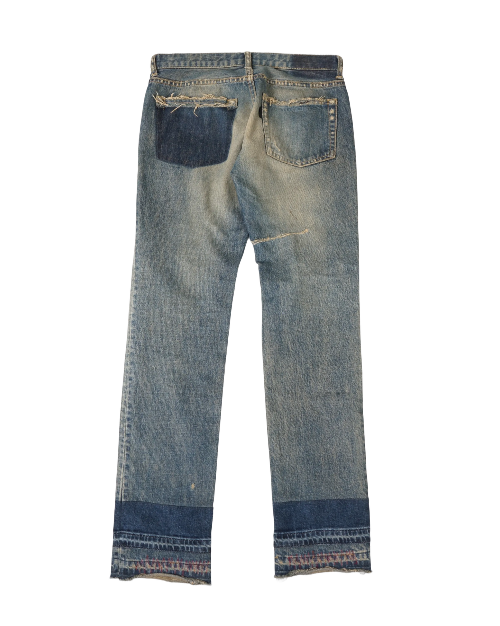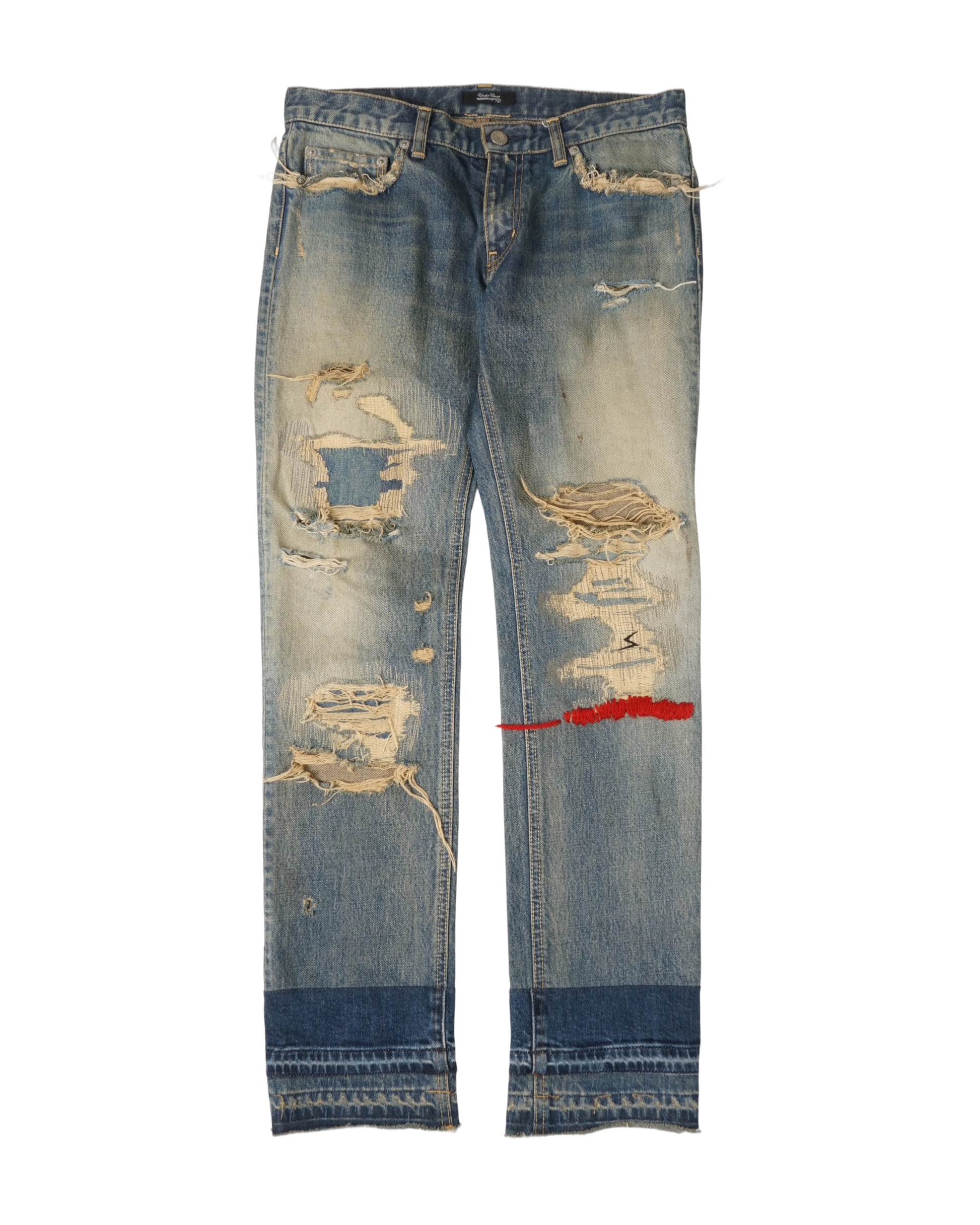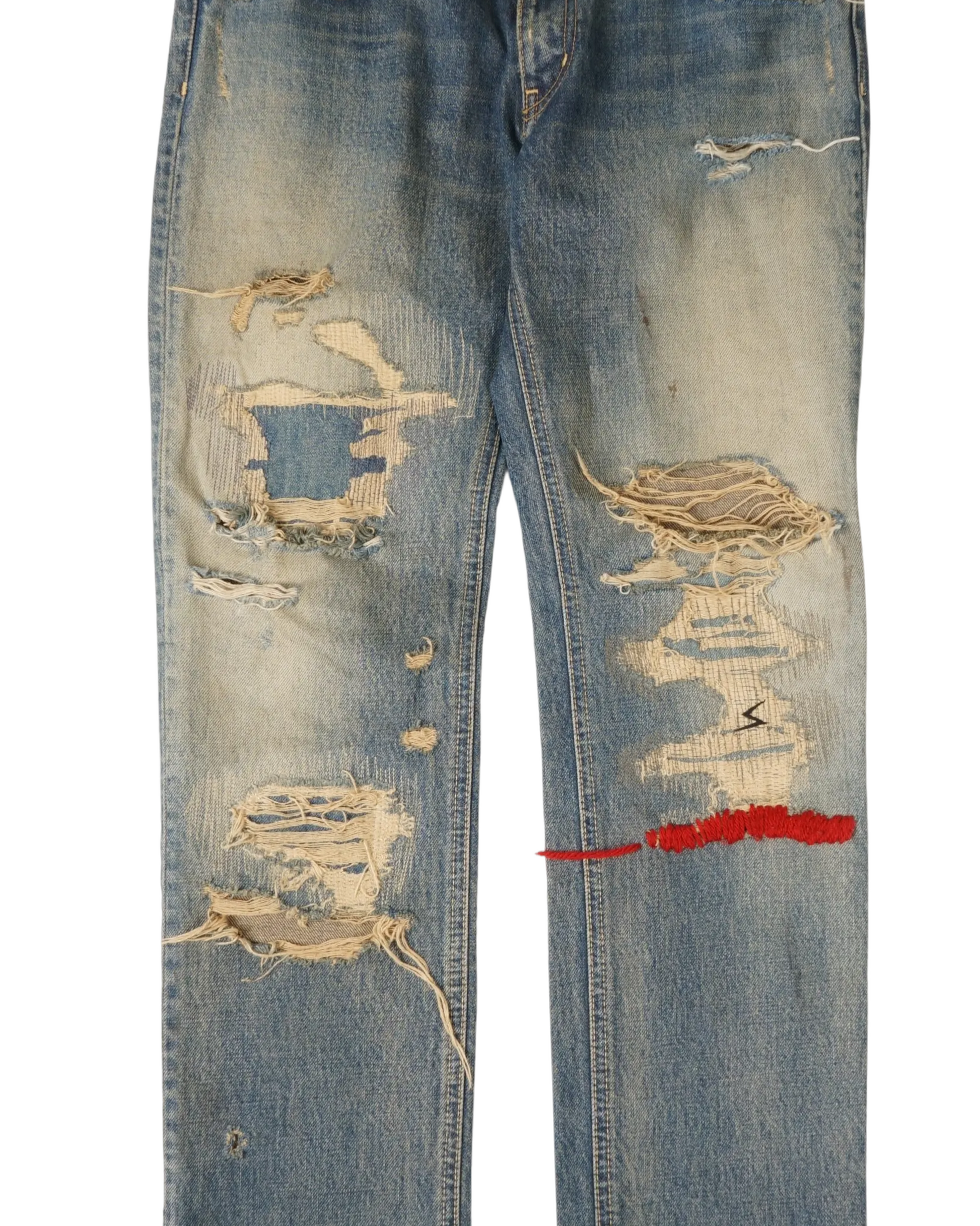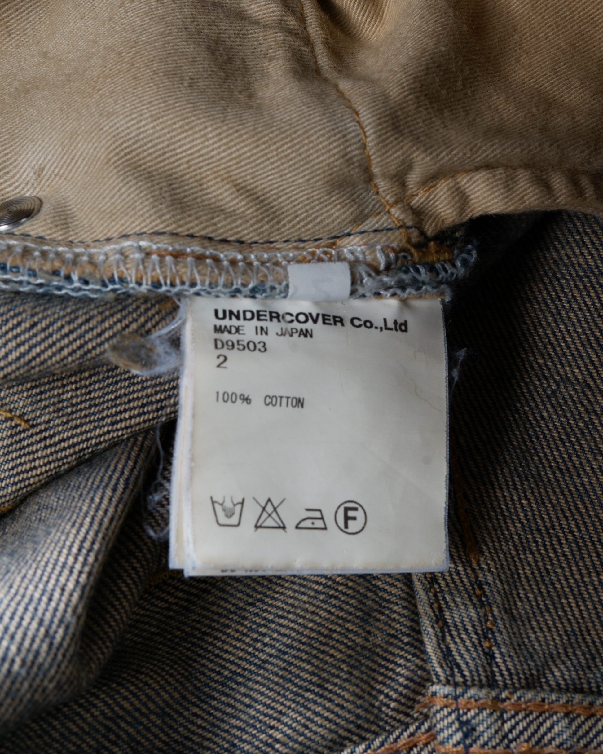 A signature piece from Undercover’s early denim experiments, the “68” Red Yarn Denim showcases Jun Takahashi’s ability to merge classic workwear with subversive detailing. Cut from robust Japanese denim, the jeans feature a straight-to-slightly-tapered silhouette with a structured, vintage-inspired hand feel. Their standout element is the distinctive red yarn threading—subtle but intentional accents that run through the construction, adding depth, contrast, and an unmistakable sense of Undercover’s craft-driven identity.