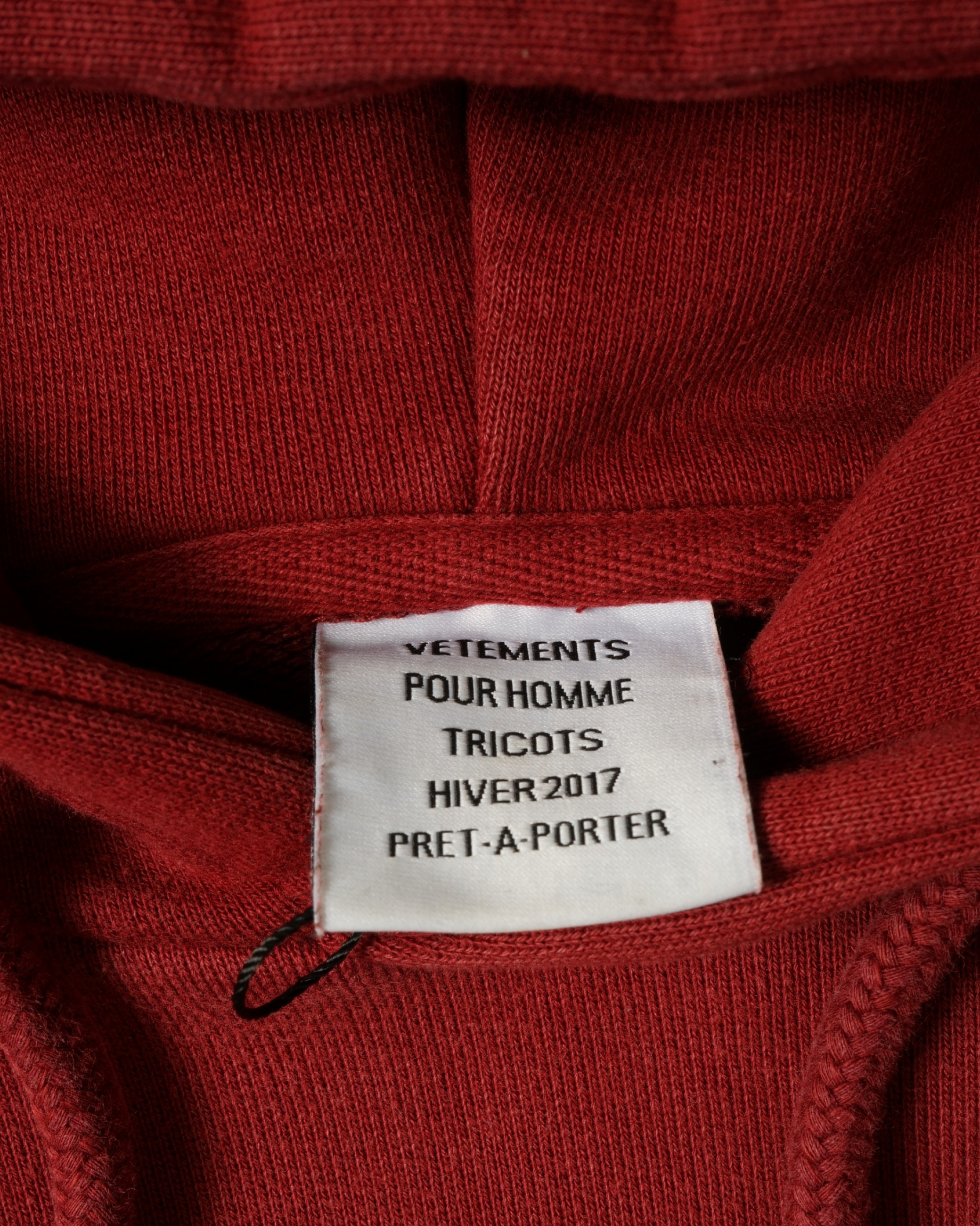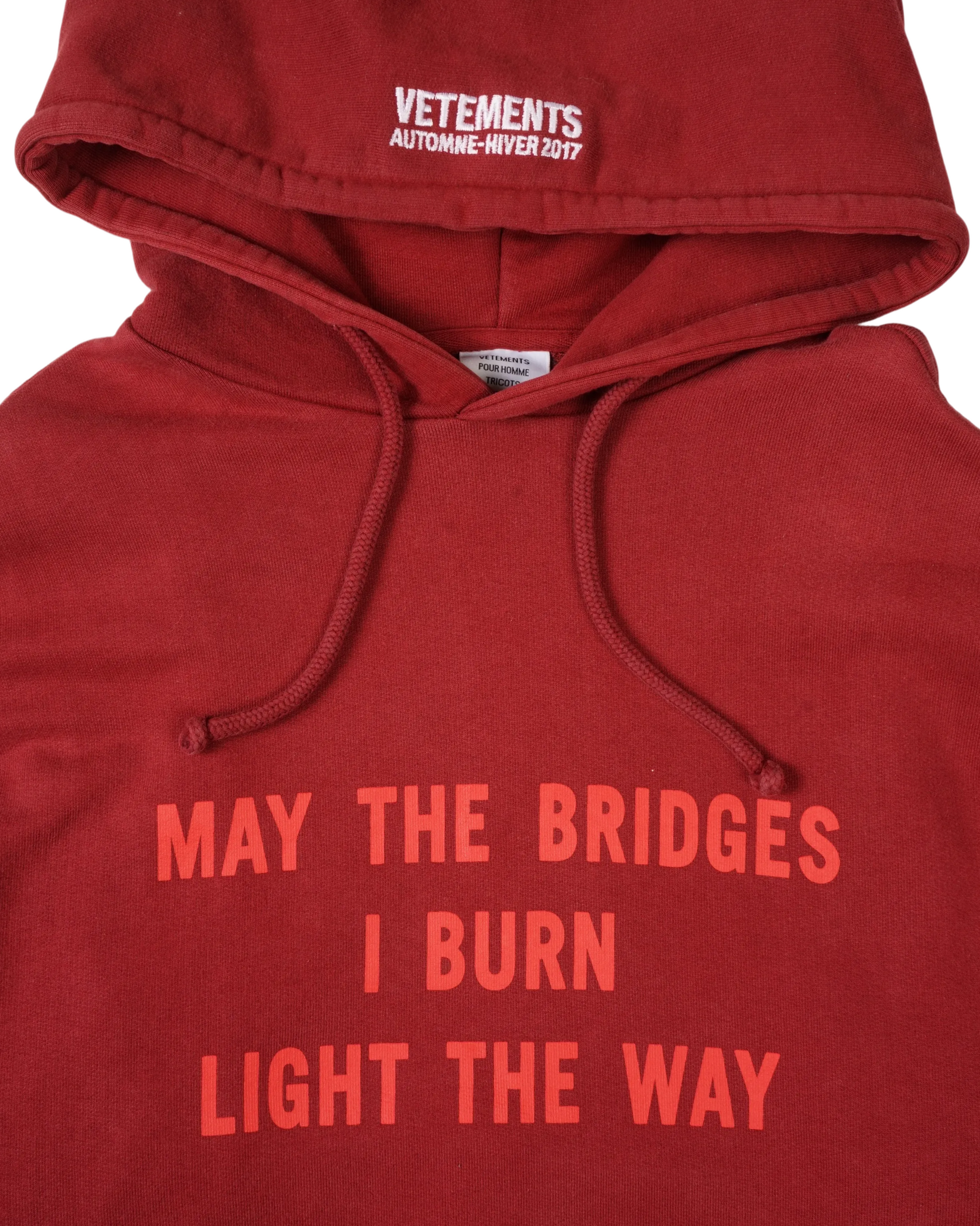 The Vetements “May the Bridges I Burn Light the Way” Hoodie is one of the brand’s most recognizable statement pieces—an embodiment of its irreverent, confrontational approach to streetwear. Crafted from an ultra-heavyweight cotton jersey, the hoodie features an intentionally oversized silhouette with exaggerated proportions, dropped shoulders, and a slouching drape that defines the label’s signature fit.