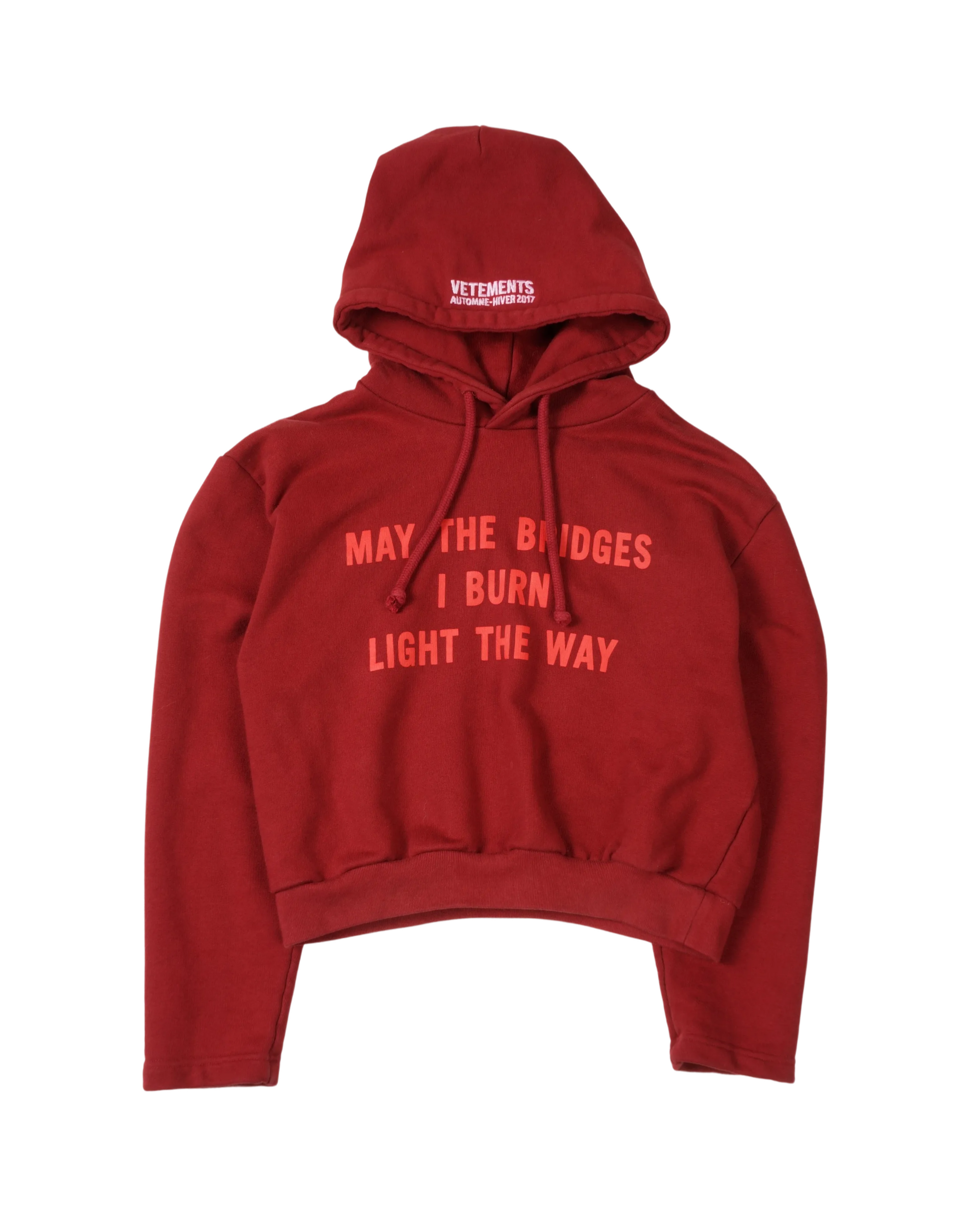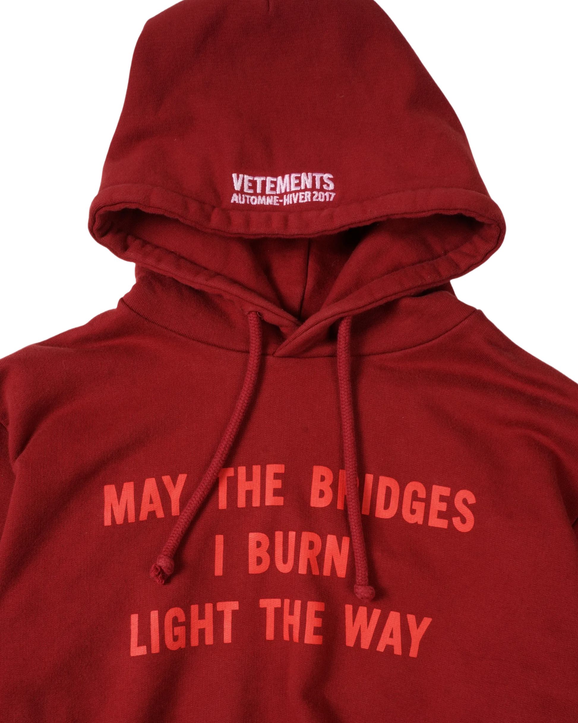 The Vetements “May the Bridges I Burn Light the Way” Hoodie is one of the brand’s most recognizable statement pieces—an embodiment of its irreverent, confrontational approach to streetwear.