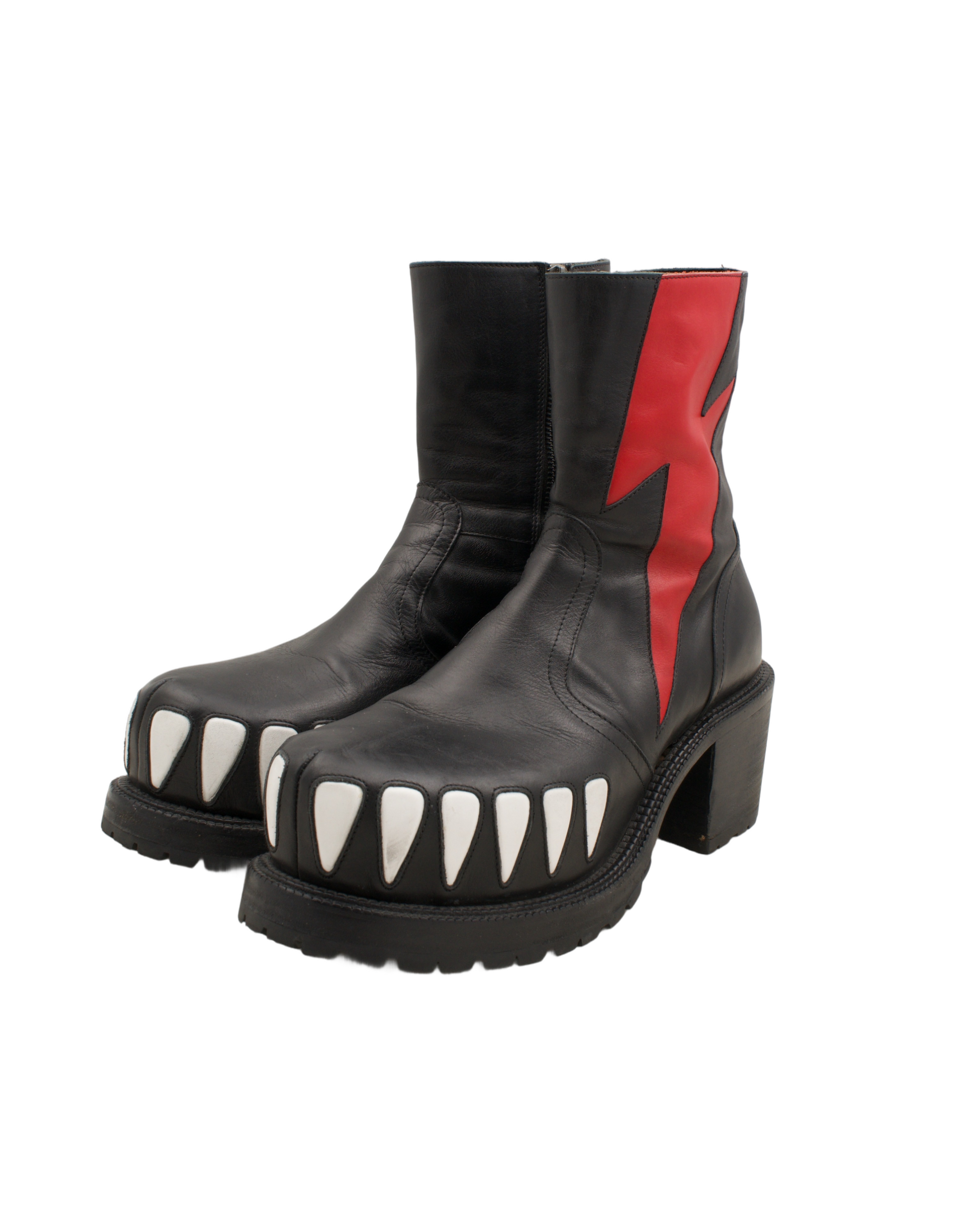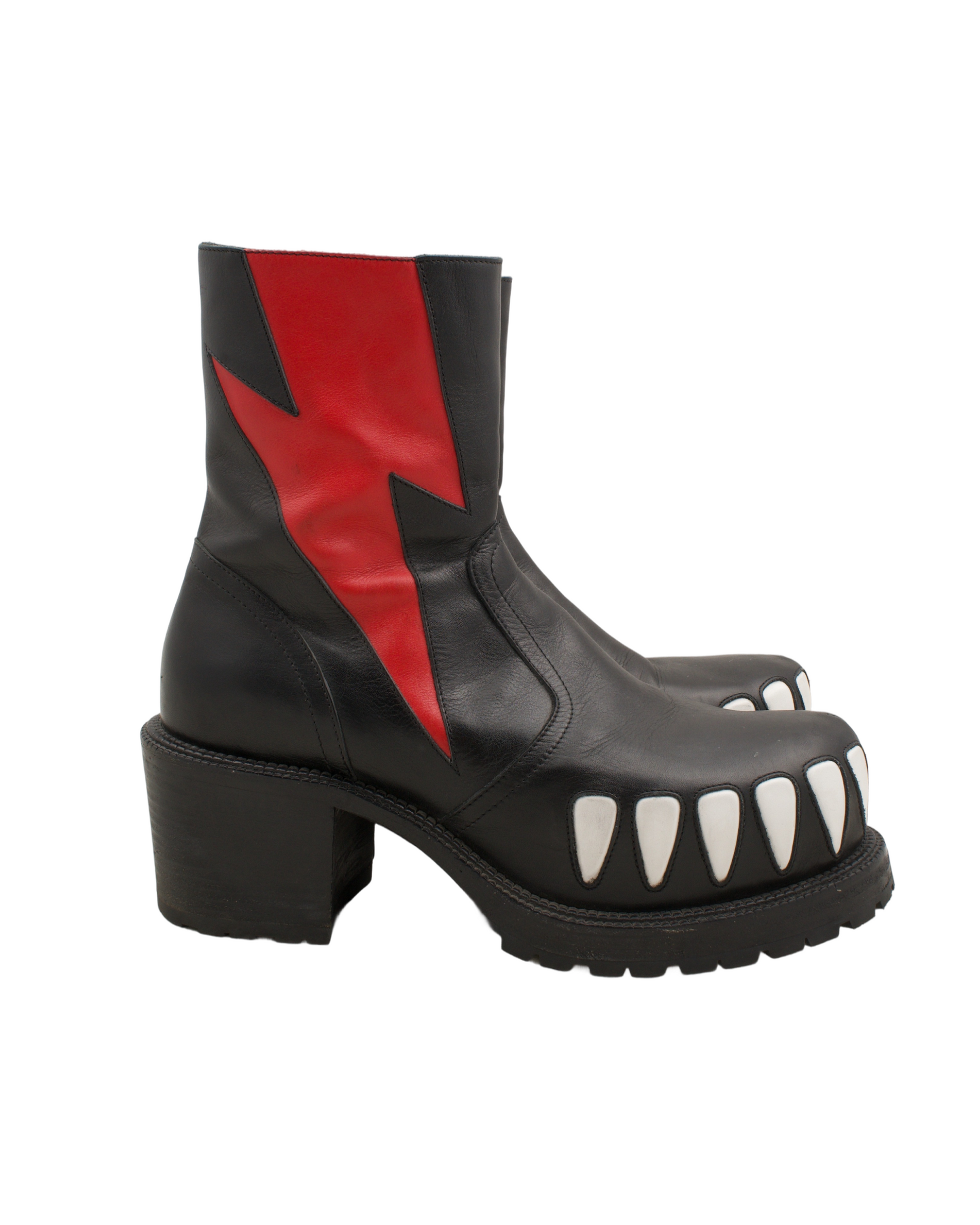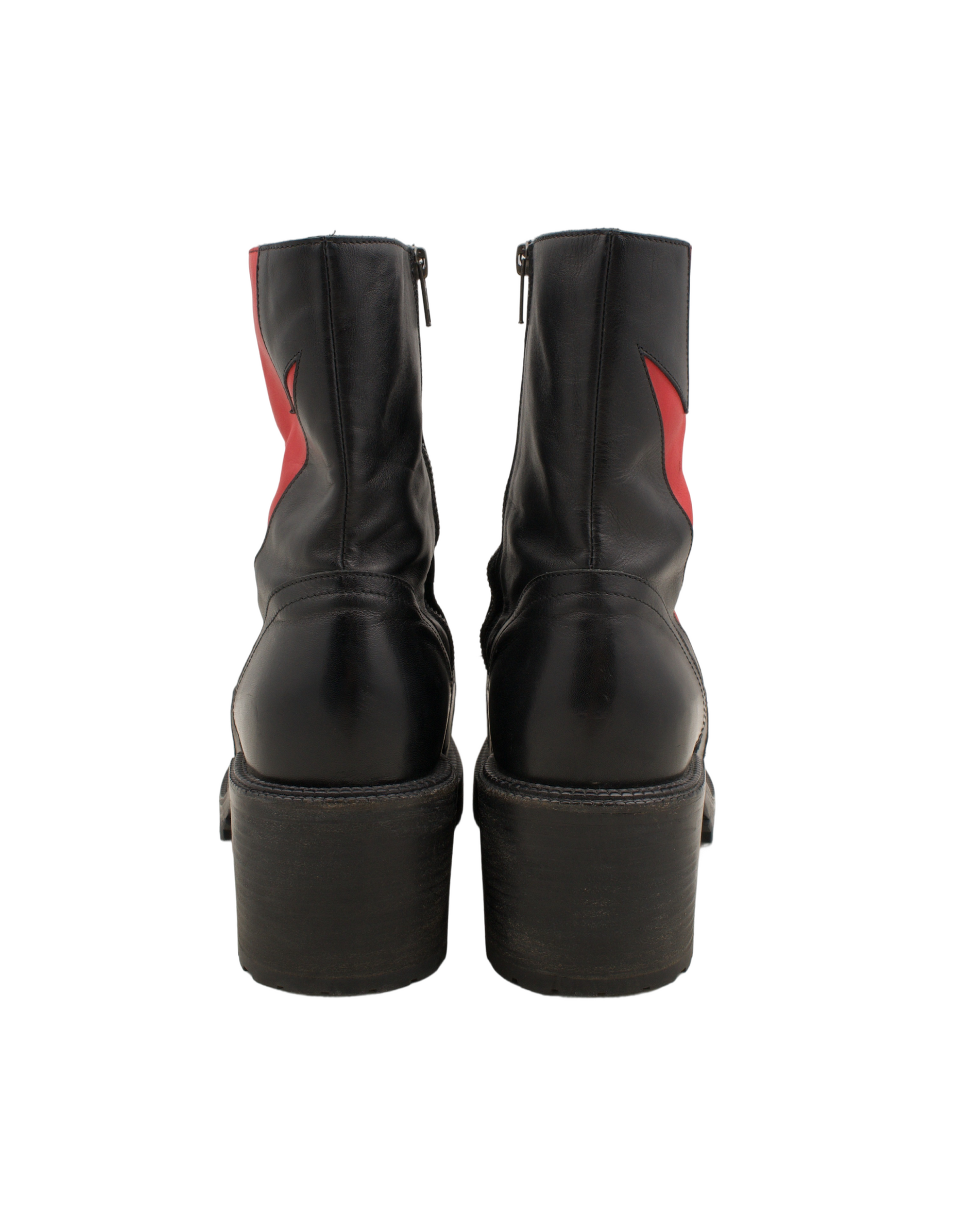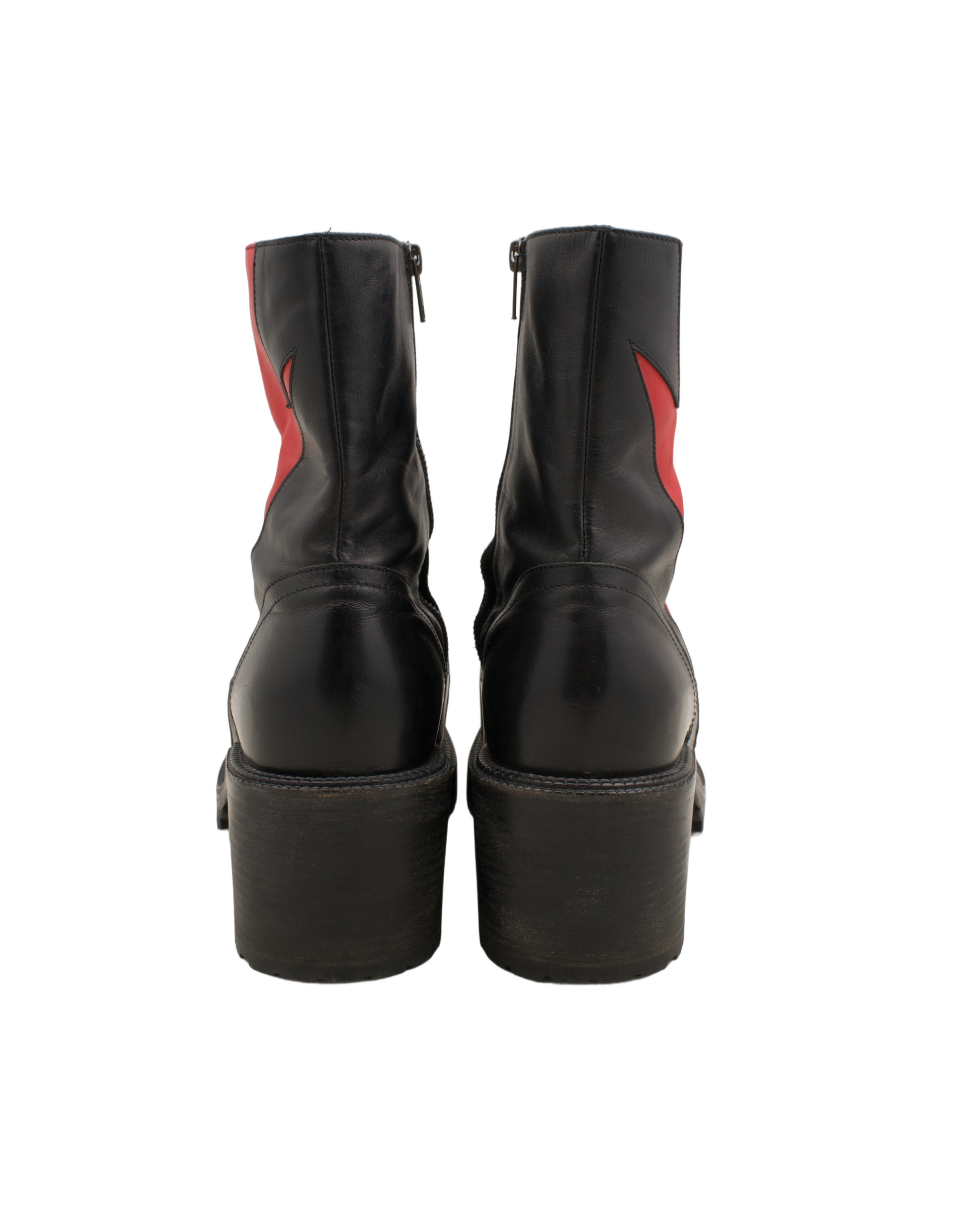 Hyper Glam Ankle Boots from Walter Van Beirendonck featuring paneled design, size zip, ankle length, round toe, low block heel, rubber sole, branded inside, and black/red calf leather.
